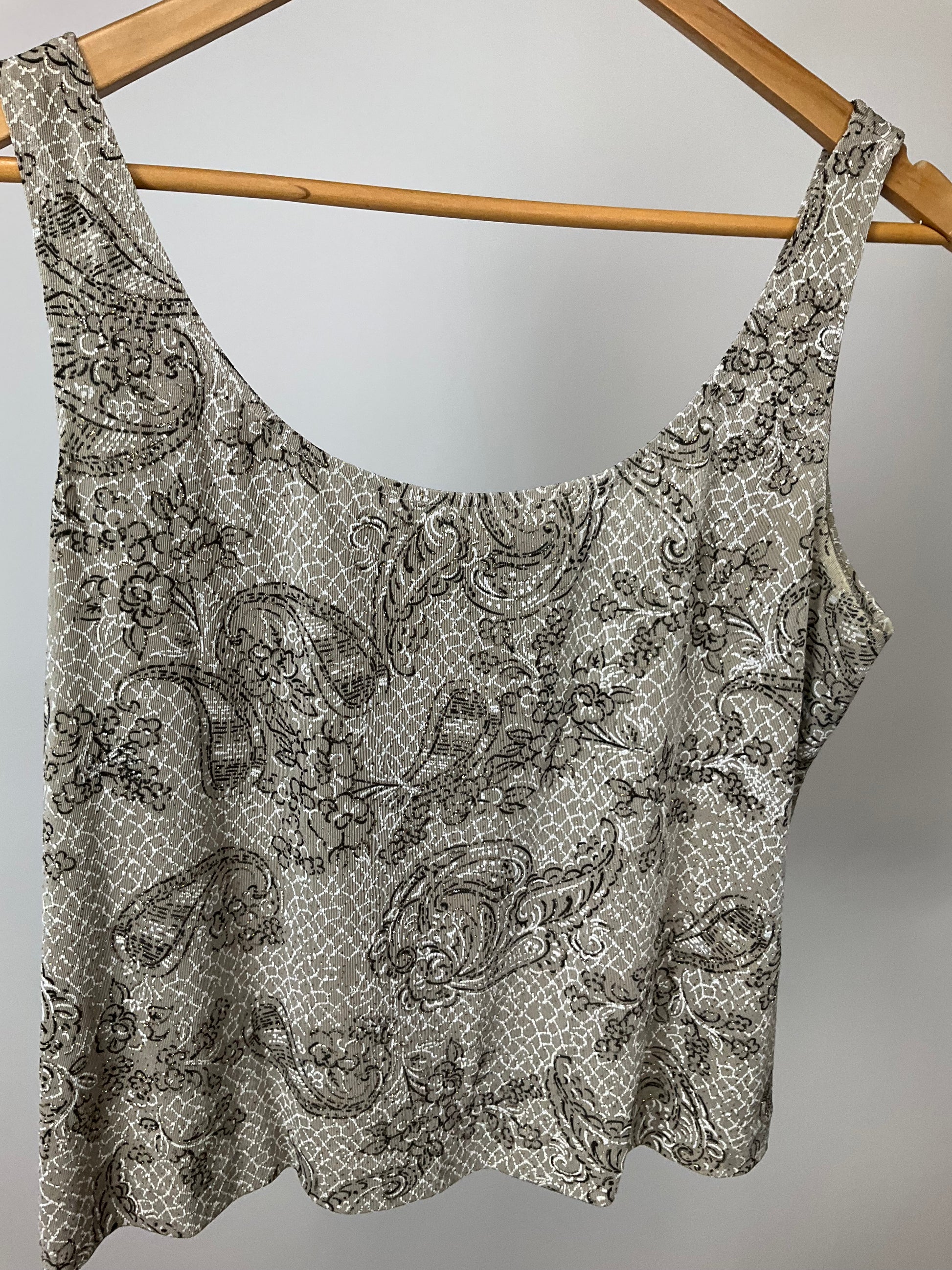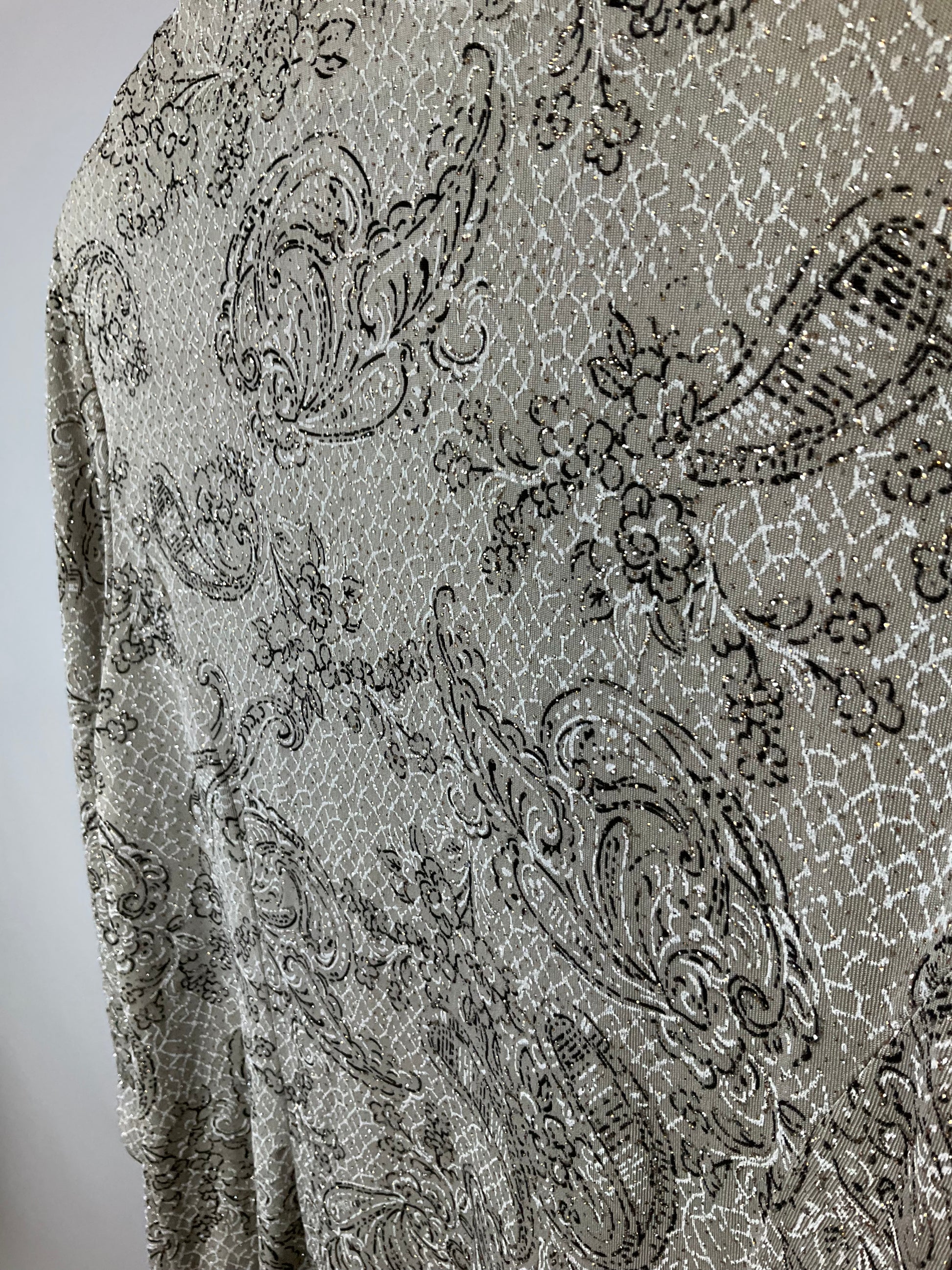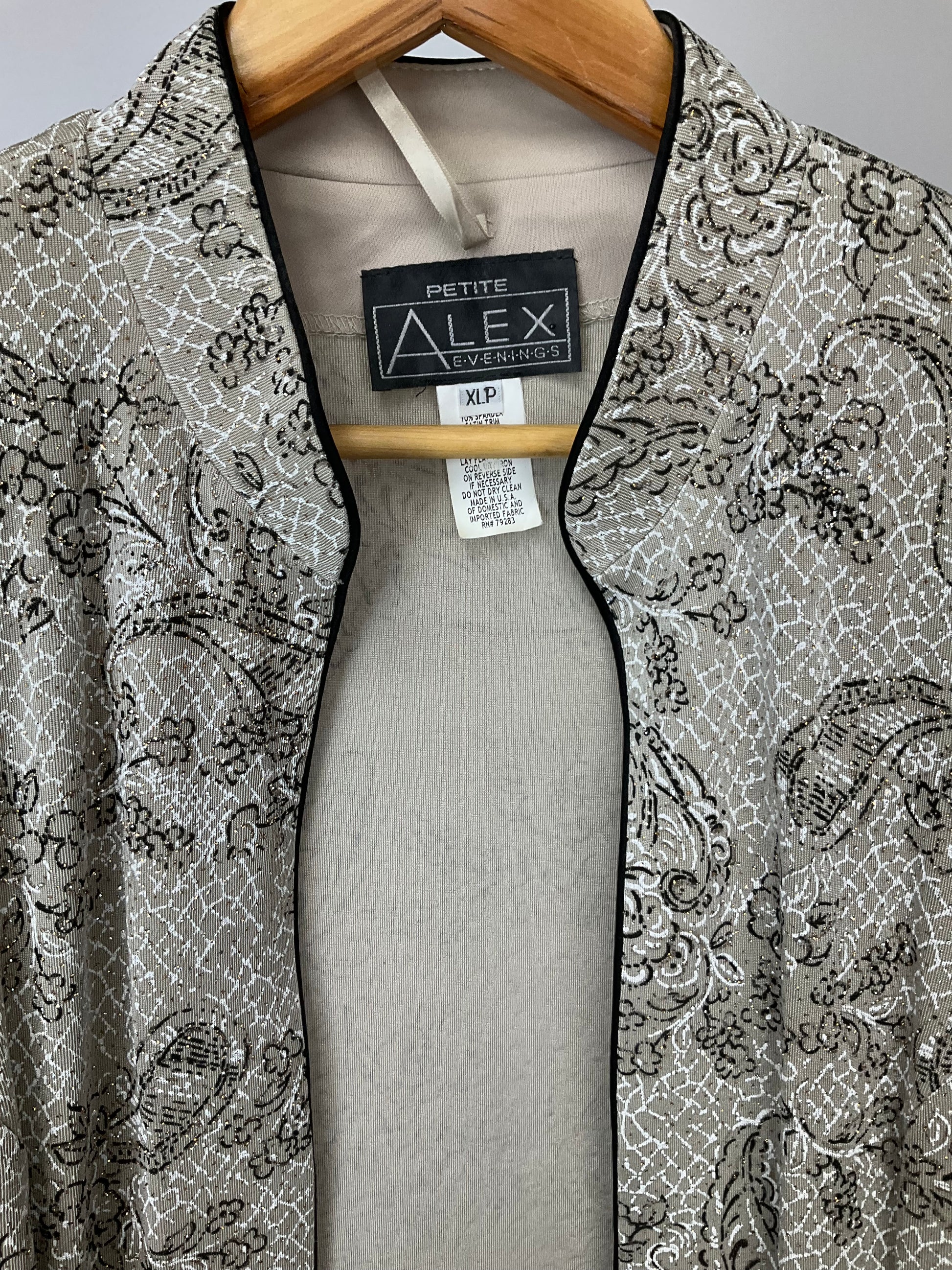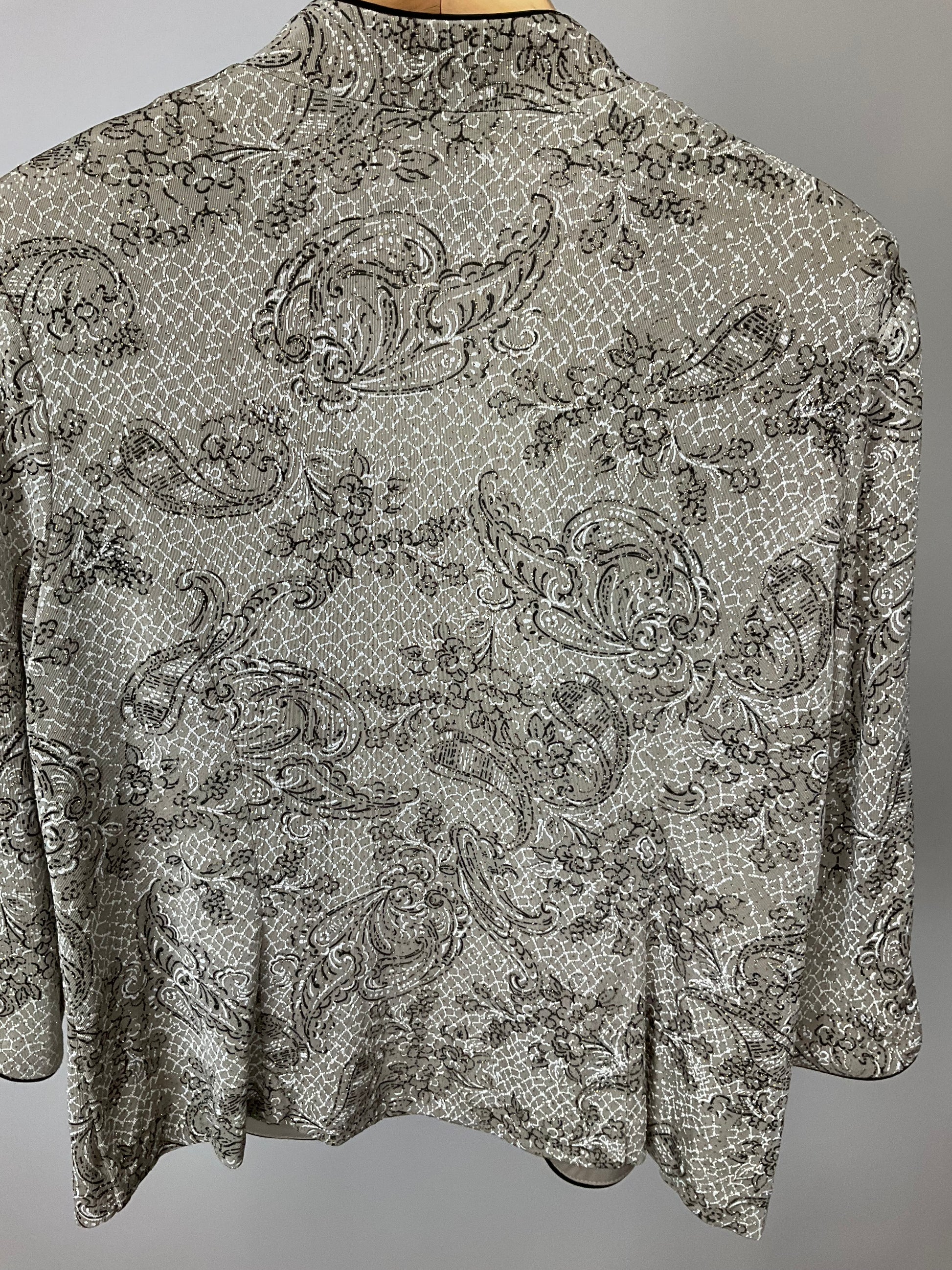 Description : ALEX EVENING OPEN FRONT TAN WITH BROWN AND GILTTER SCROLL AND FLORAL PATTERN JACKET WITH MANDARIN COLLAR. MATCHING SHELL. LOTS OF STRETCH TO FABRIC, HALF SLEEVES. MEASUREMENTS ARE FOR OUTER JACKET.