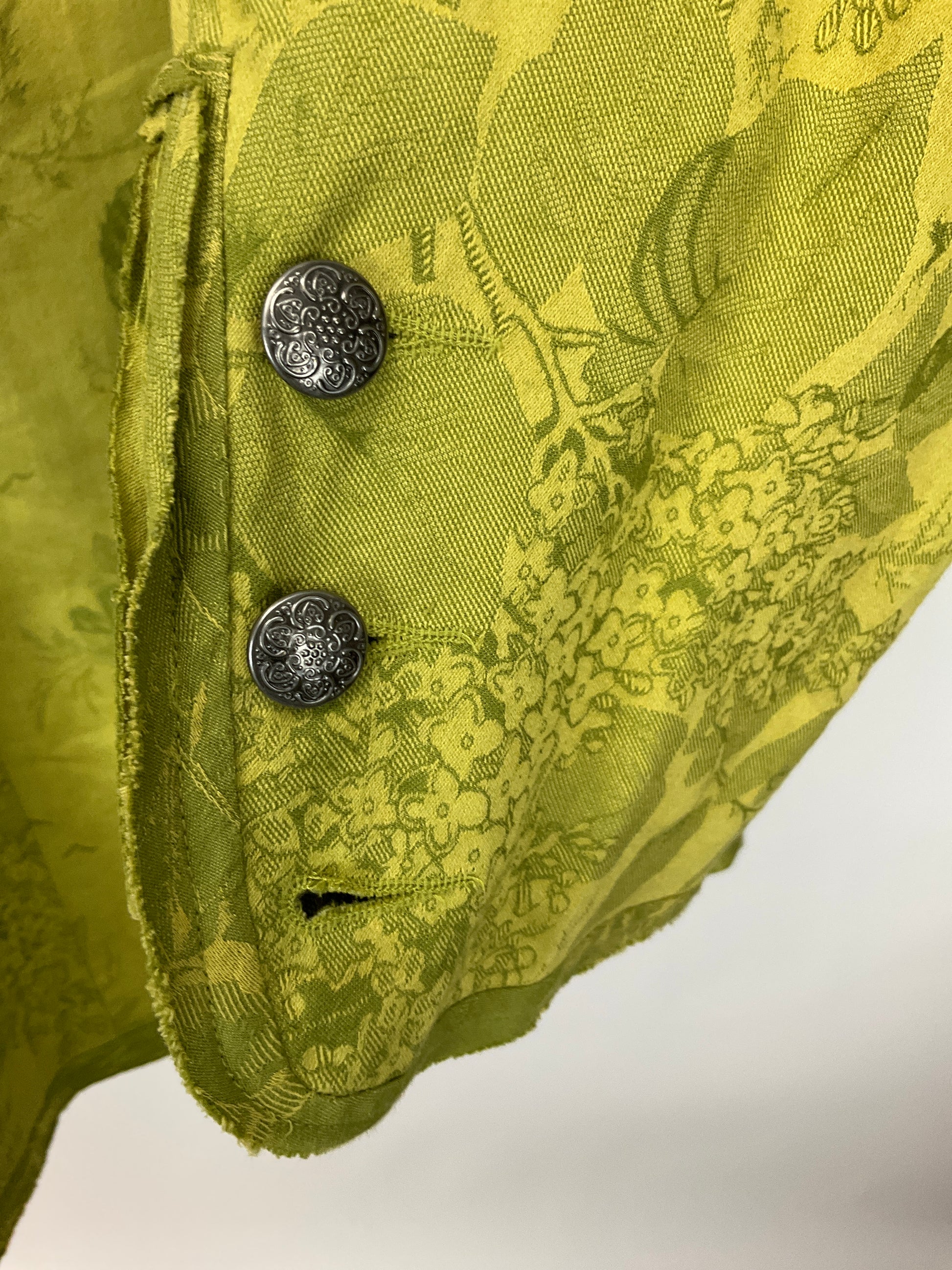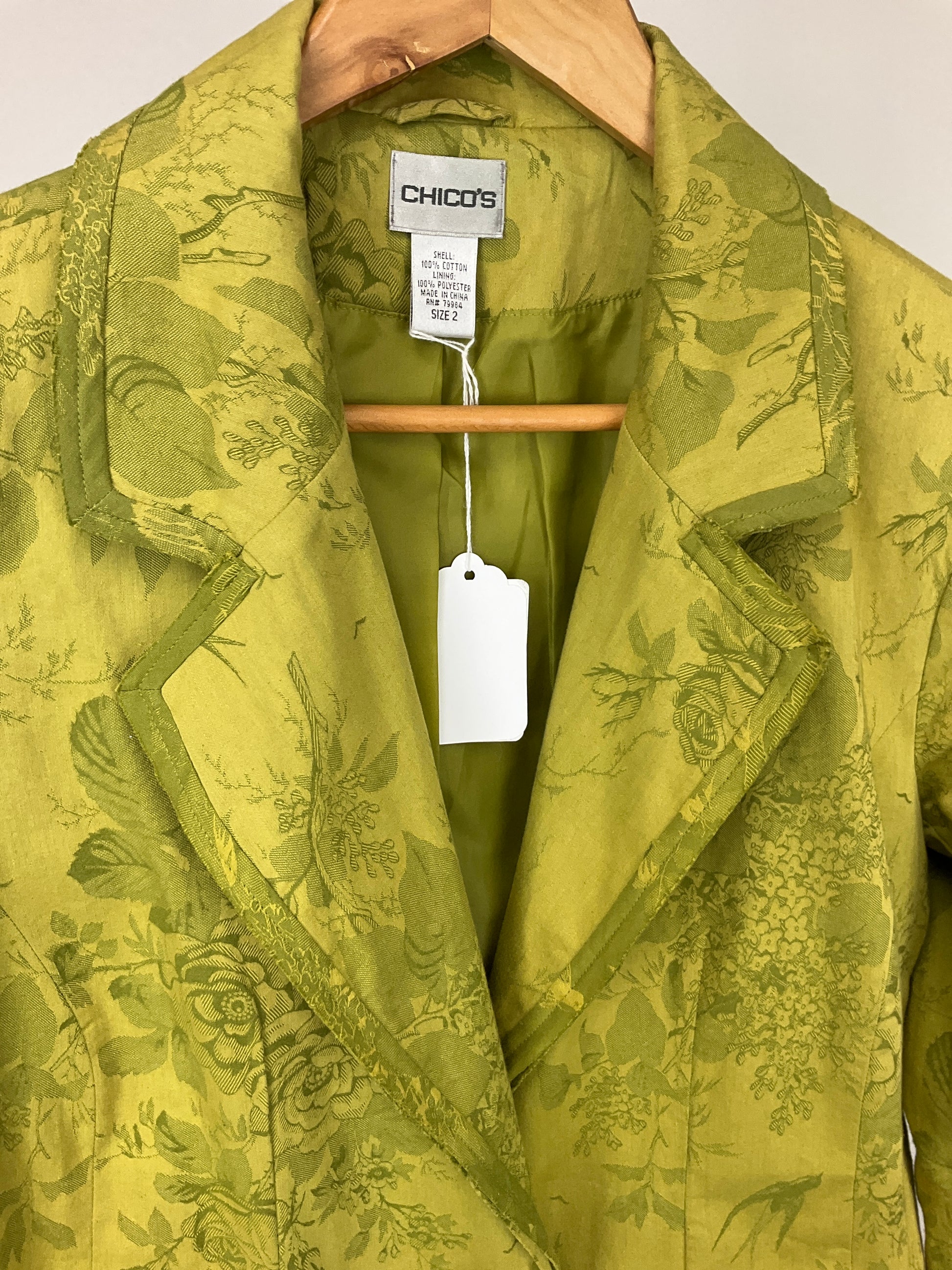 Description : CHICO’S BLAZER GREEN WITH FLORAL AND BIRD PRINT WITH TEO METAL BUTTON FRONT CLOSURE, WELTED POCKETS AND FULLY LINED. ONE SLEEVE IS MISSING ONE BUTTON.