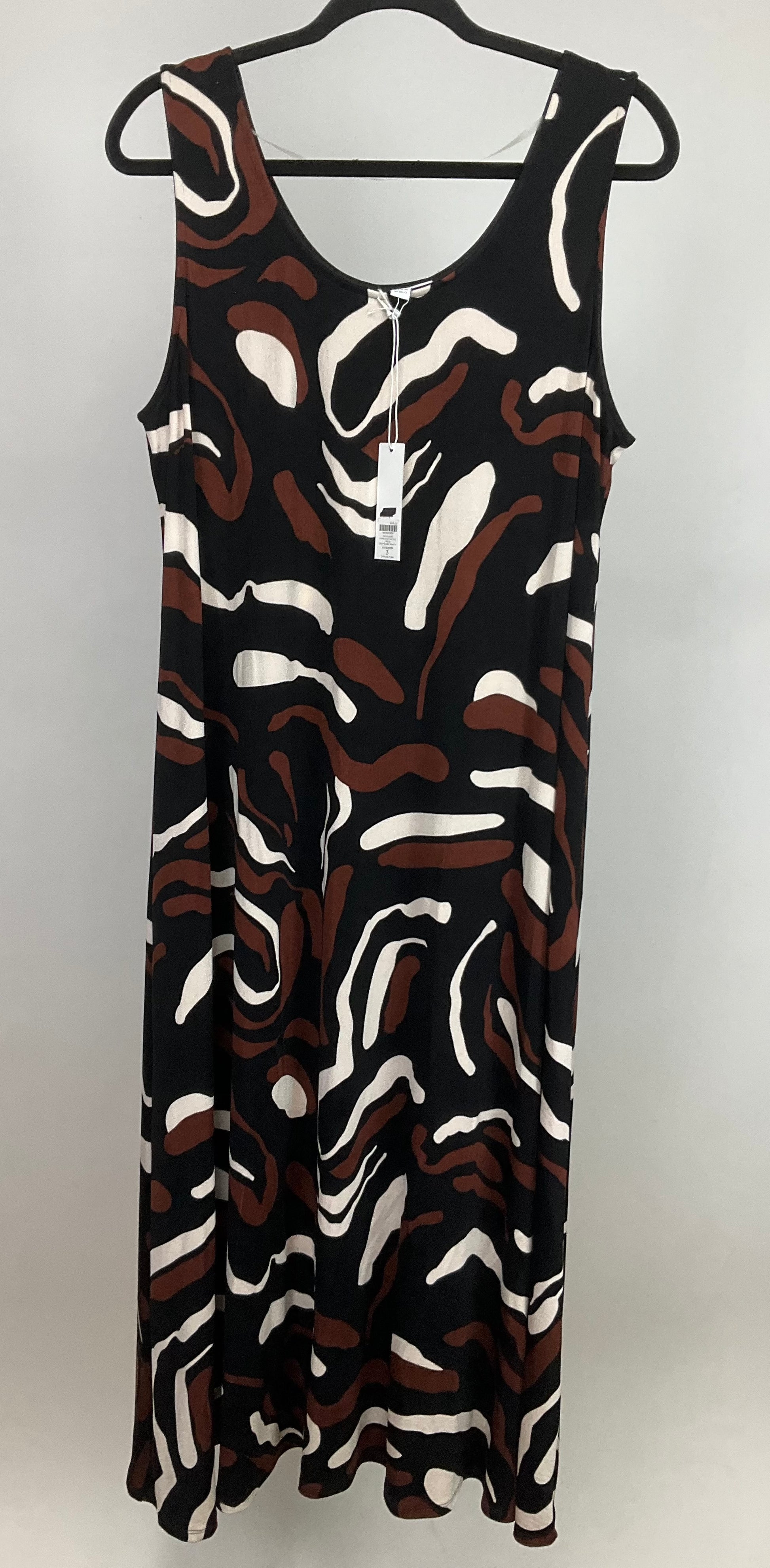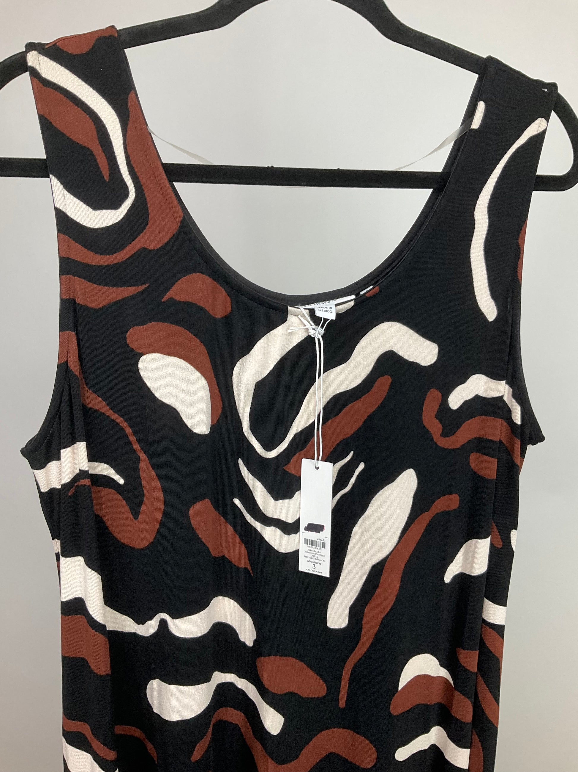 Description : NWT CHICO'S SLEEVELESS LONG FLOWING DRESS IN BLACK, BROWN AND CREAM BOLD PATTERN. GREAT WRINKLE RESISTANT TRAVELER FABRIC. PULL OVER STYLE WITH LOTS OF STRETCH TO FABRIC, CHICO'S SIZE 3 WHICH IS SIMILAR TO SIZE 16. GREAT CRUISE DRESS TOO.