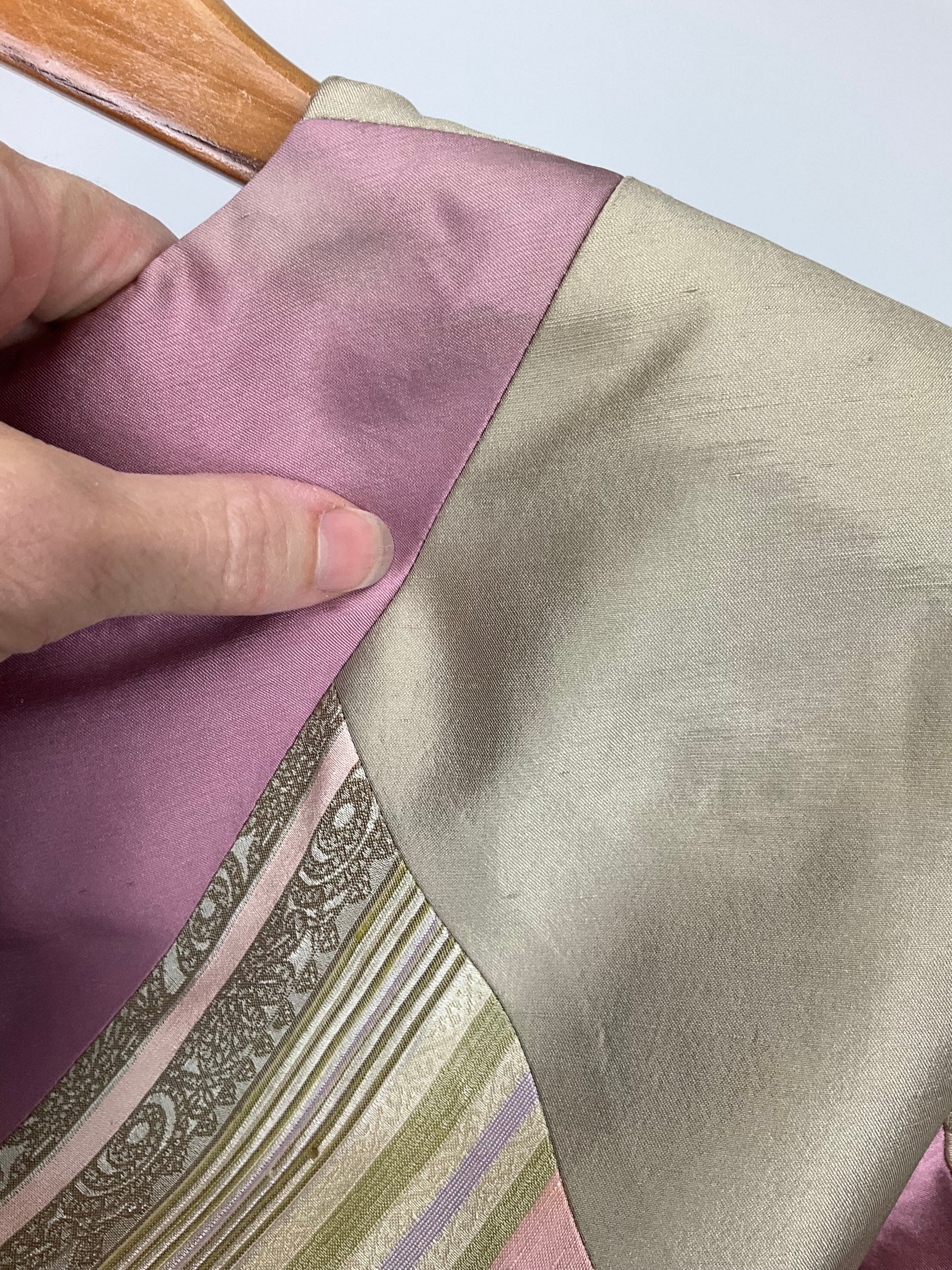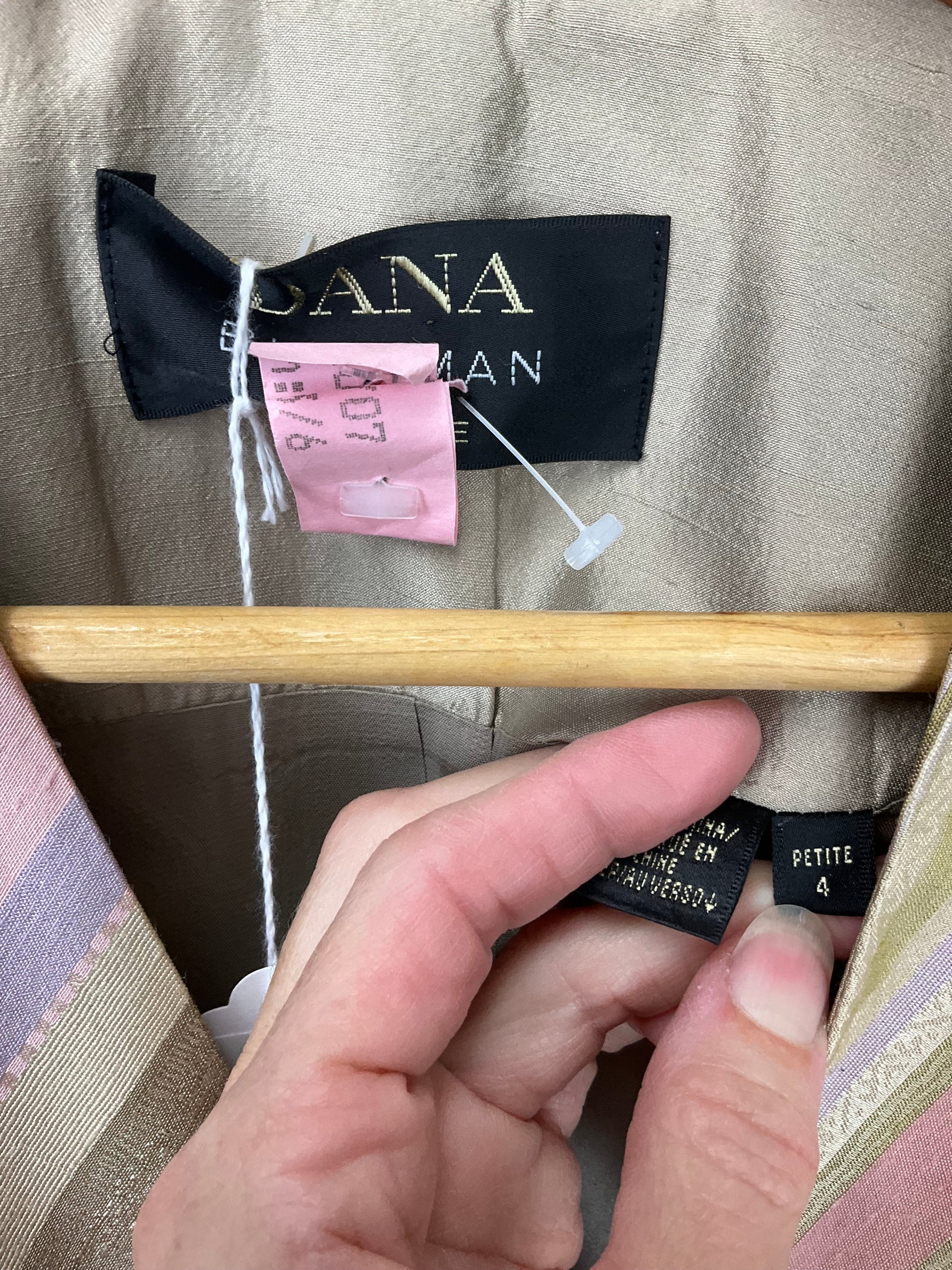 Description : DANA BUCHMAN SILK MUTED PINK AND GREEN PATHCWORK SKIRT SUIT. BLAZER IS SIZE 4P PATCHWORK STYLE IN SHADES OF PINK, GREEN AND A LITTLE TOUCH OF LAVENDER.V-NECK WITHOUT LAPEL, HIDDEN FRONT HOOK & EYE CLOSURES, FULLY LINED, FULL LENGTH SLEEVES. LIGHT STAIN ON RIGHT SHOULDER BY NECKLINE. SOLID PINK MATCHING SKIRT IN SIZE 2P WITH CENTER BACK KICK PLEAT, CENTER BACK HIDDEN ZIPPER AND POCKETS ON RIGHT SIDE.