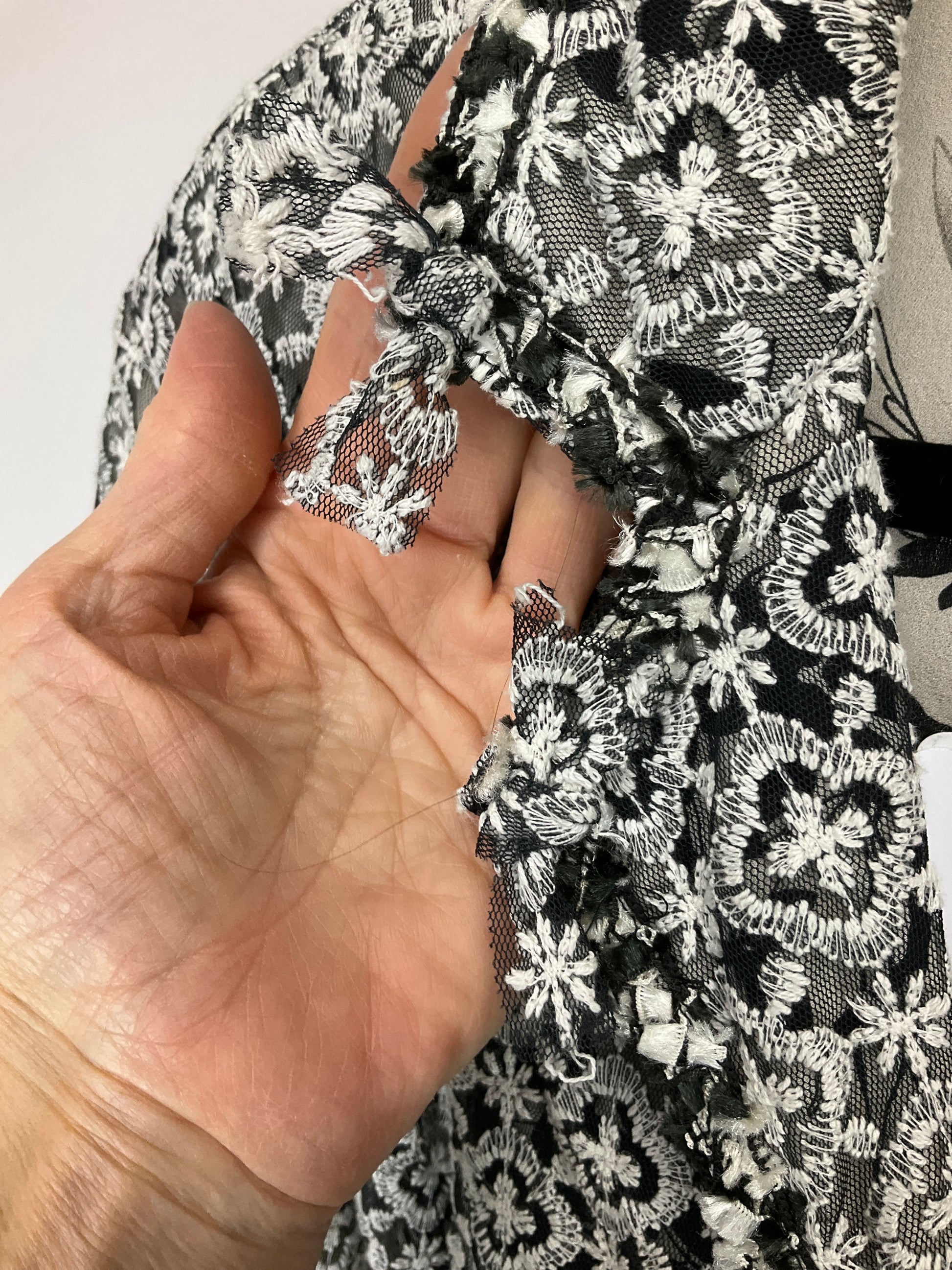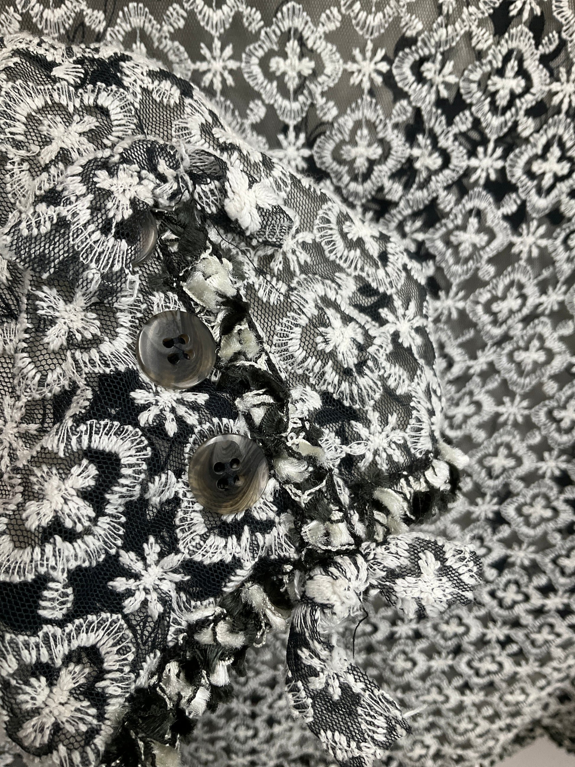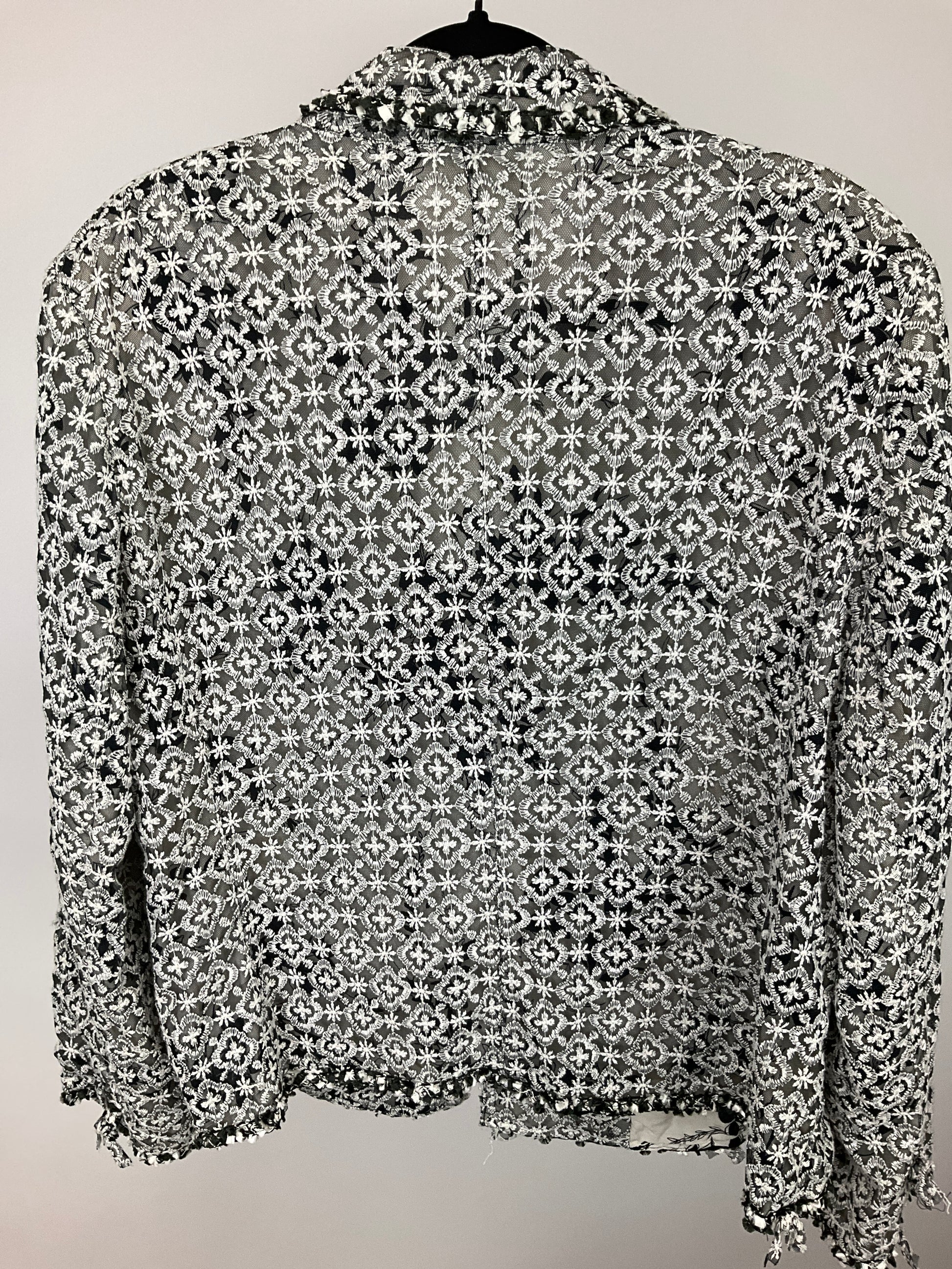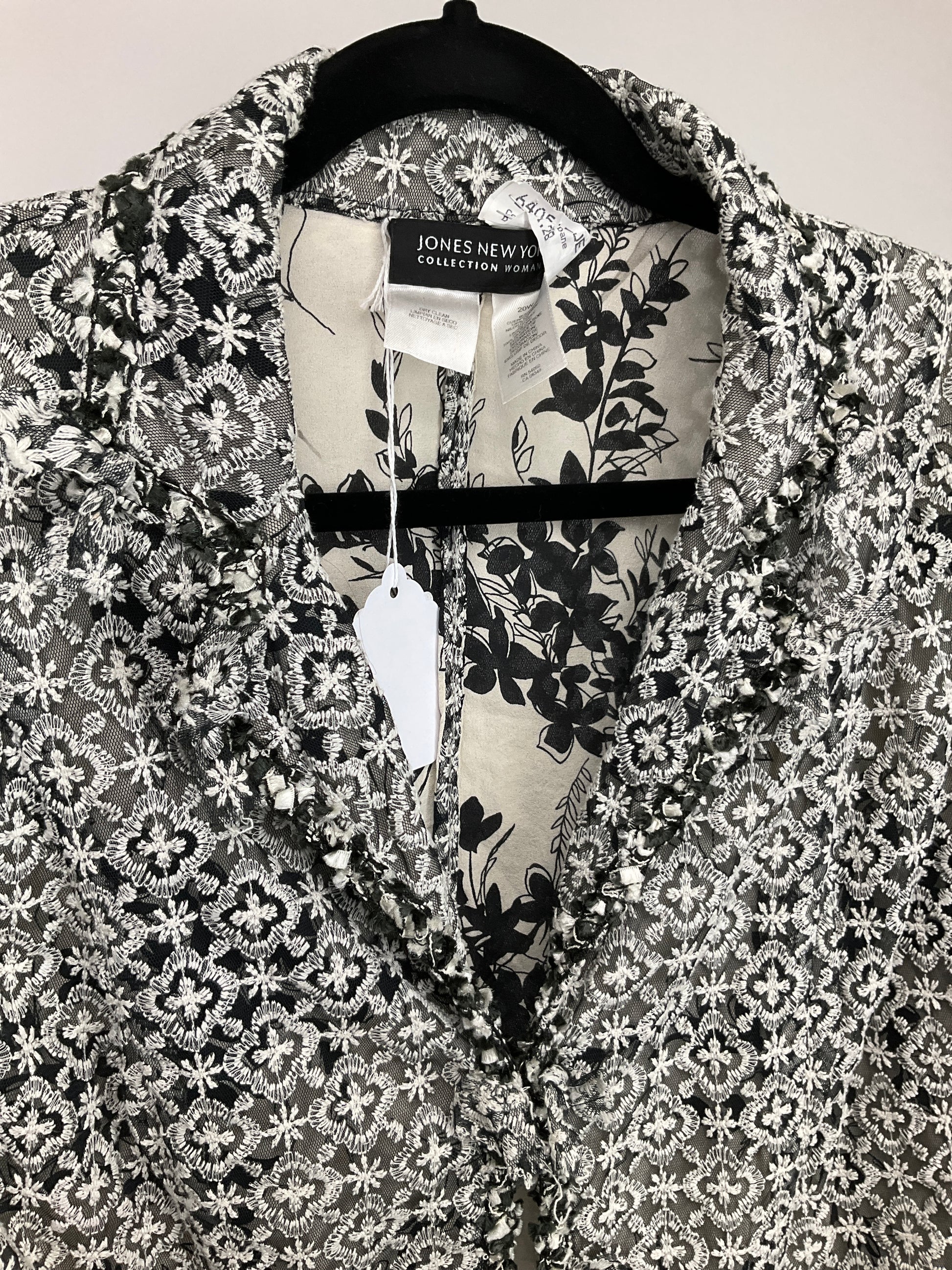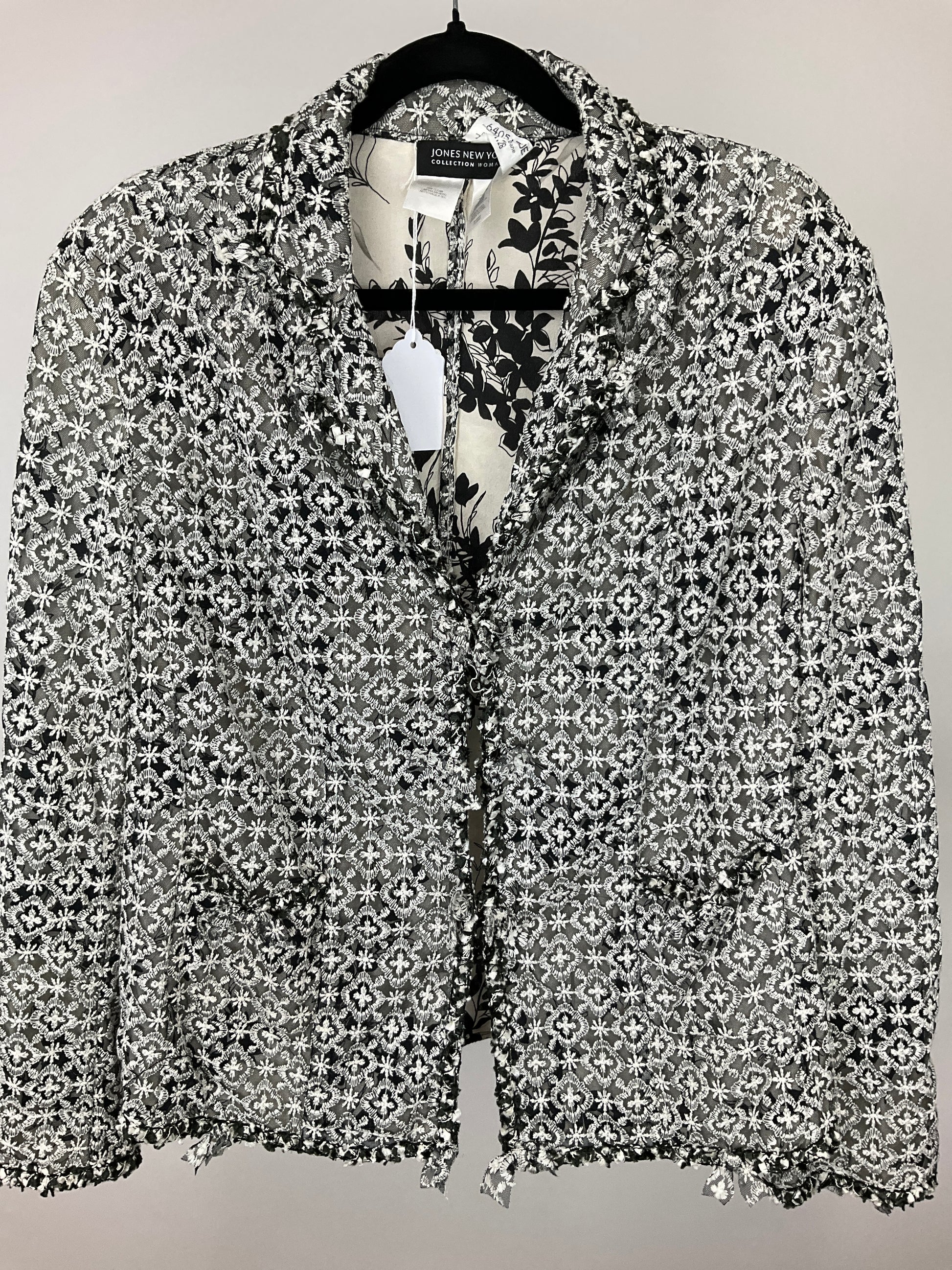 Description : JONES NEW YORK WHITE BLACK LACE OVERLAY BLAZER WITH PATCH POCKETS, NOTCHED LAPEL AND FULLY LINED. TWO HOOK AND EYE FRONT CLOSURE.