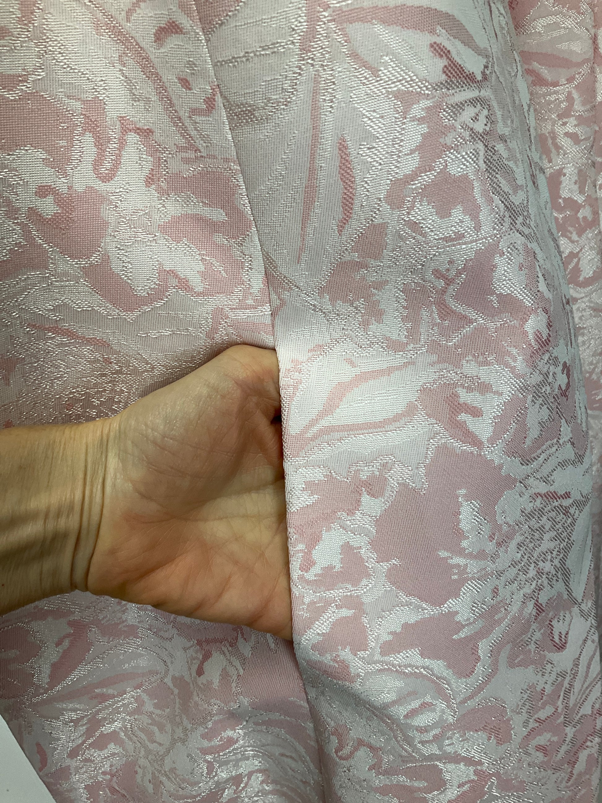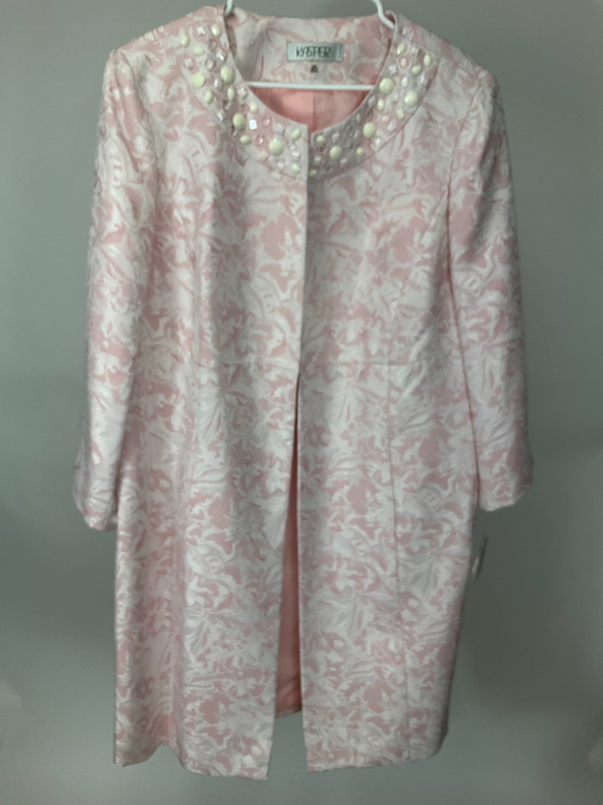 Description : NEW WITH TAGS KASPER TUXEDO LENGTH PINK AND WHITE BLAZER. THE WHITE FLORAL PATTERN OVERLAY IS IN SHIMMER THREAD, SINGLE FORNT HOOK AND EYE CLOSURE WITH ROUND NECKLINE EMBELLISHED WITH BEADS. SLEEVES POCKETS ON FRONT PRINCESS SEAM.
