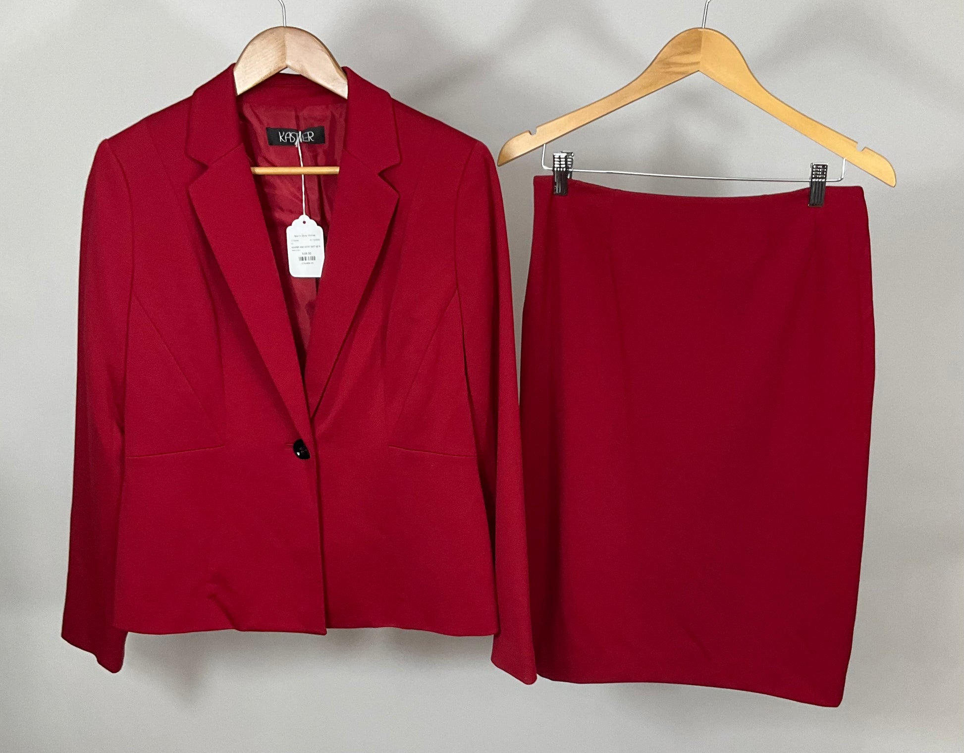 Description : KASPER CLASSIC RED SKIRT SUIT. BLAZER HAD NOTCHED LAPEL, SINGLE BLACK BUTTON FRONT CLOSURE, NO POCKETS. MATCHING PENCIL SKIRT WITH CENTER BACK KICK PLEAT AND ZIPPER.