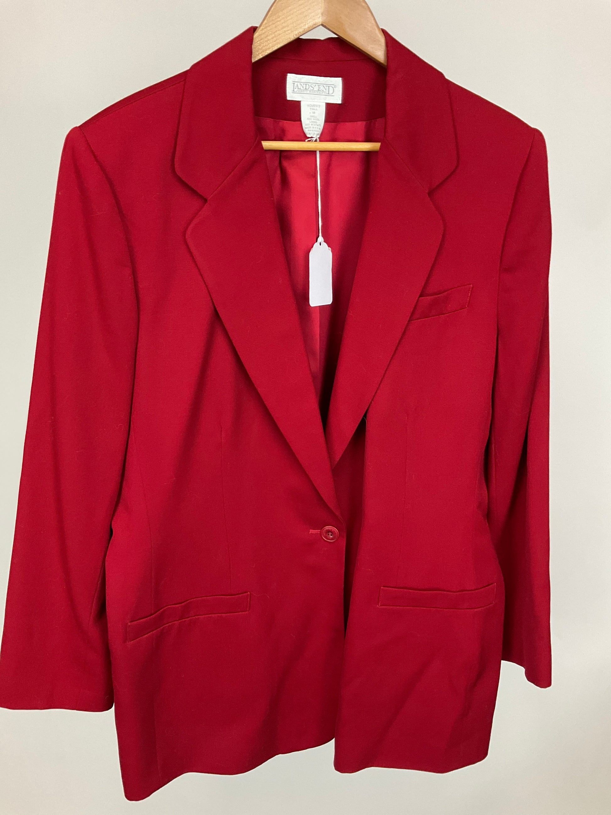 Description : CLASSIC RED BLAZER IN LONG LENGTH WITH SINGLE BUTTON FRONT CLOSURE AND WELTED POCKETS. FULLY LINED.