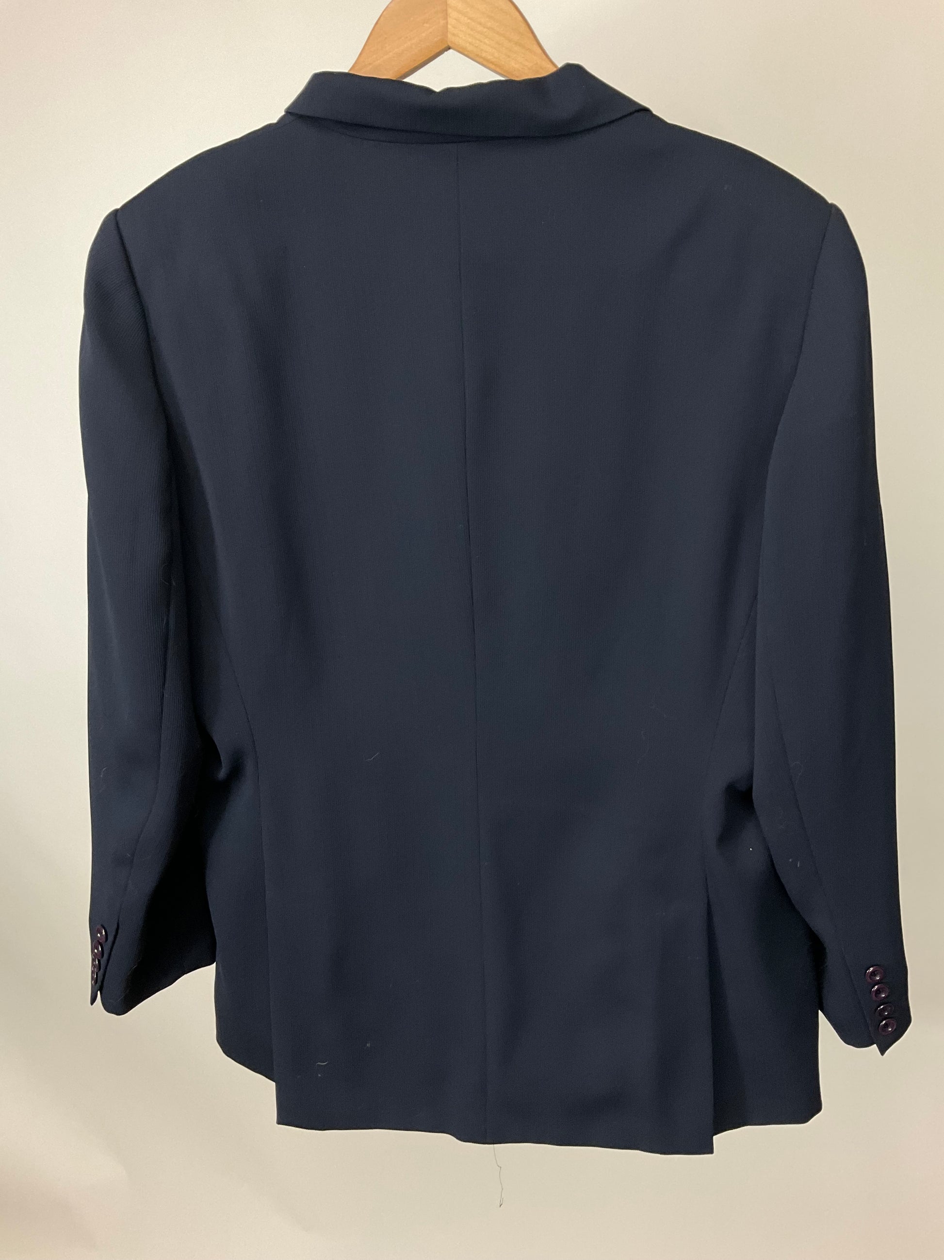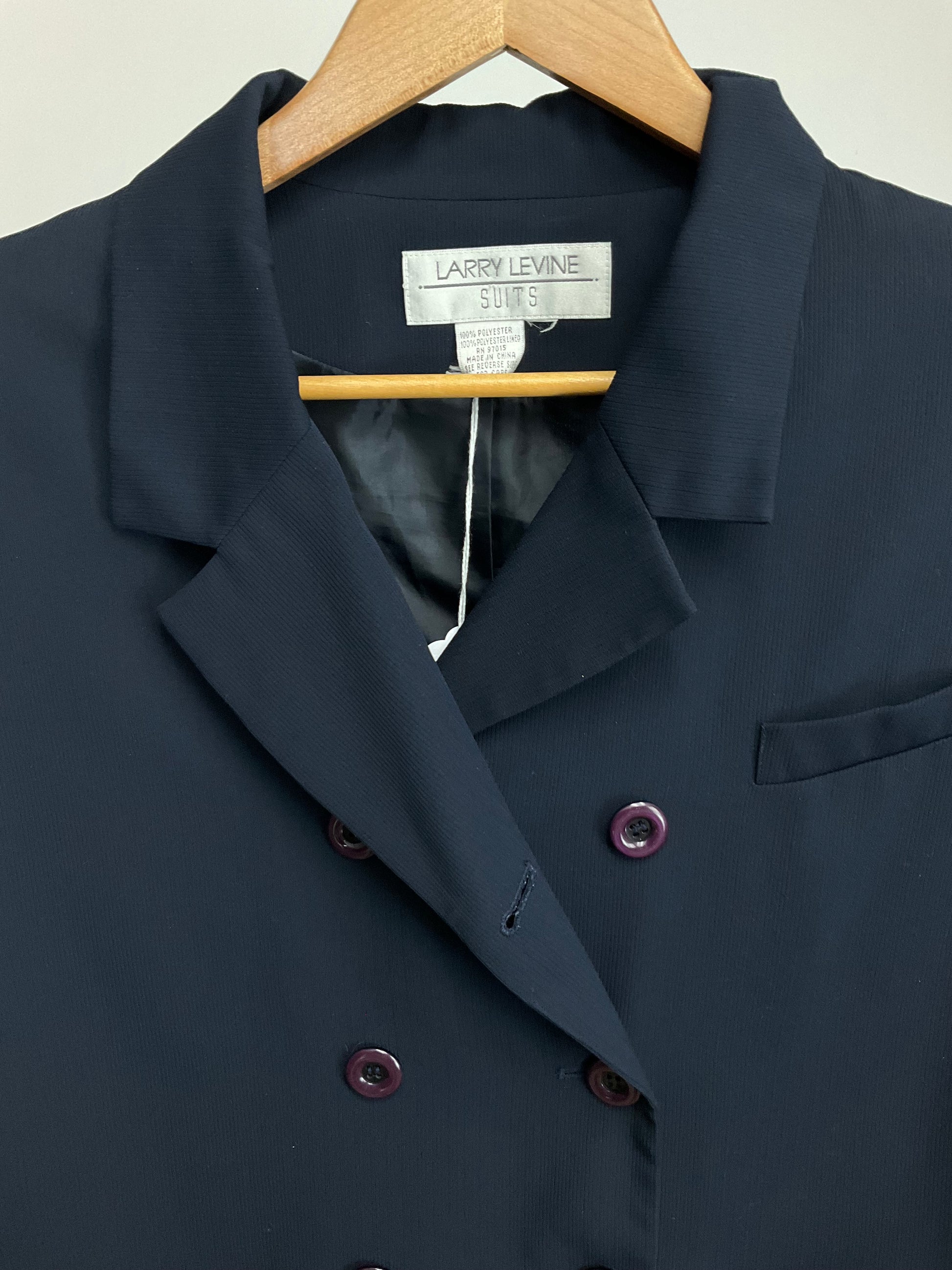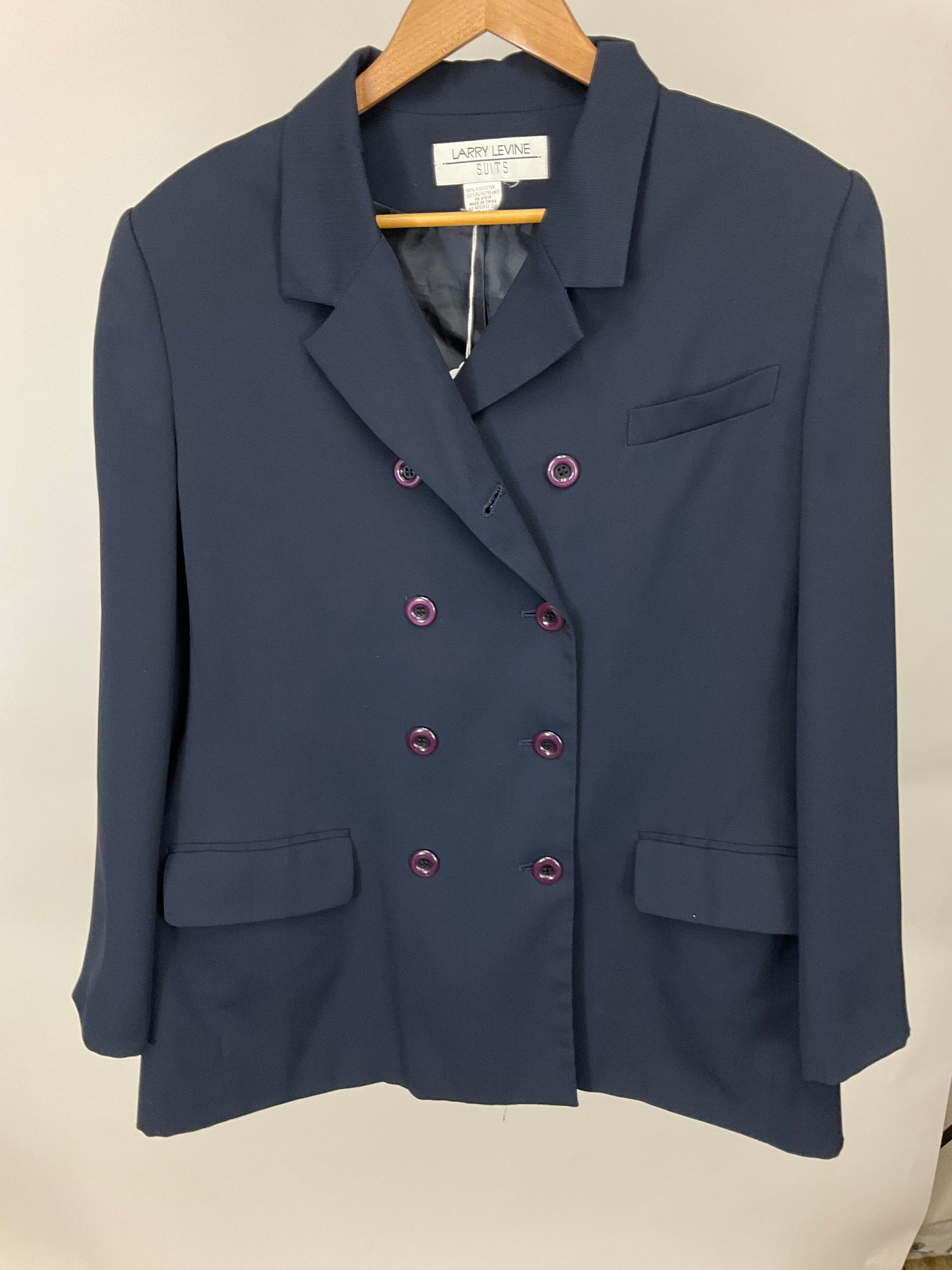 Description : LARRYBLEVEIN DOUBLE BREASTED NAVY BLUE BLAZER WITH FLAP POCKETS AND MATCHING PANTS. PANTS HAVE FLAT FRONT AND LEFT SIDE ZIPPER. NOTE MEASUREMENTS PAMTS APPEAR SMALLER THAN 16.