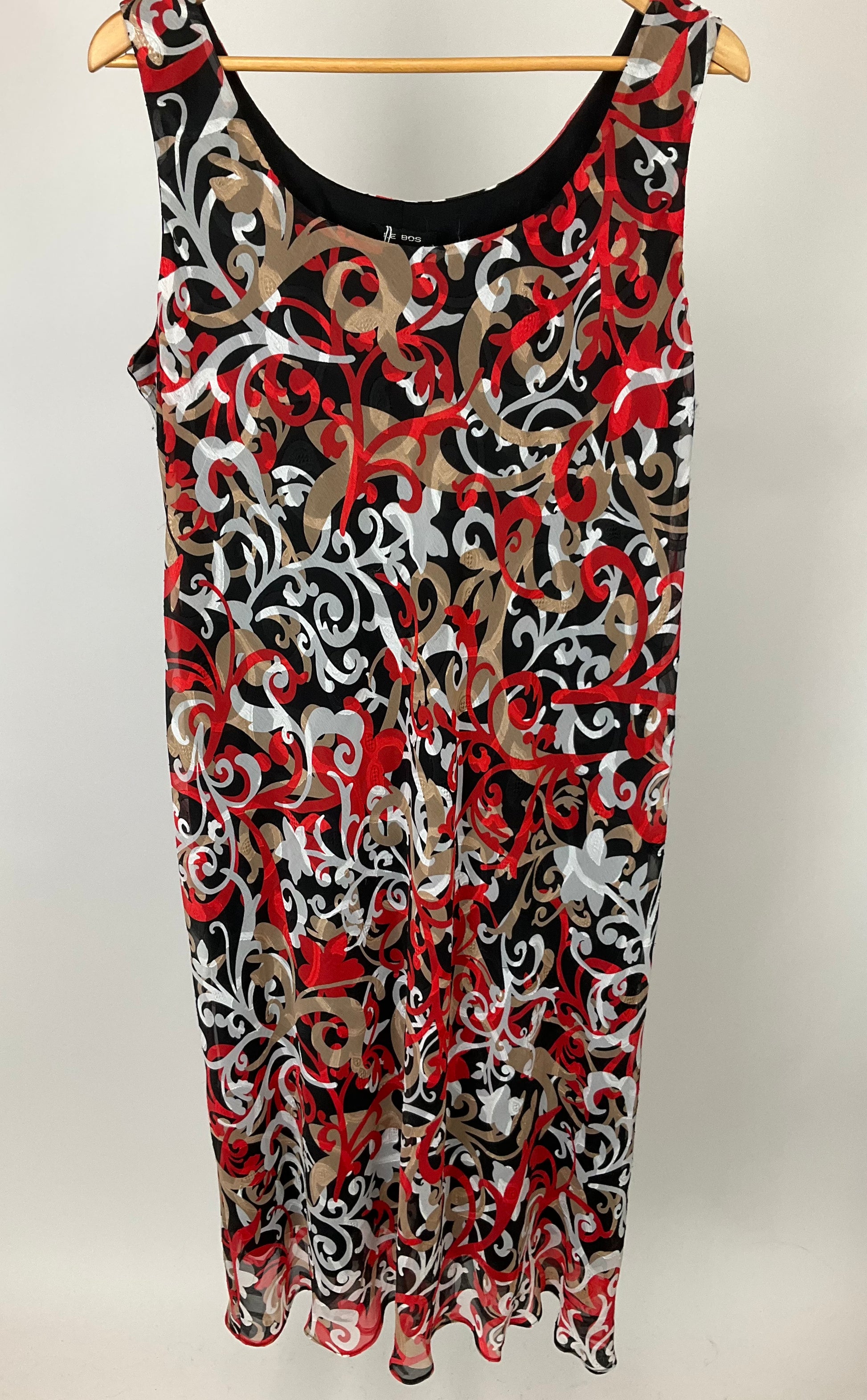 Description : LE BOS DRESS SUIT. SLEEVELESS DRESS IN BLACK, WHITE ORANGE AND GOLD SCROLL PATTERN WITH SHEER OVERLAY AND PULL-OVER STYLE. LONGER LENGTH DRESS, NOTE MEASUREMENTS. MATCHING BLACK BOLERO STYLE BLAZER WITH HALF SLEEVES, SINGLE BUTTON FRONT CLOSURE AND FULLY LINED.