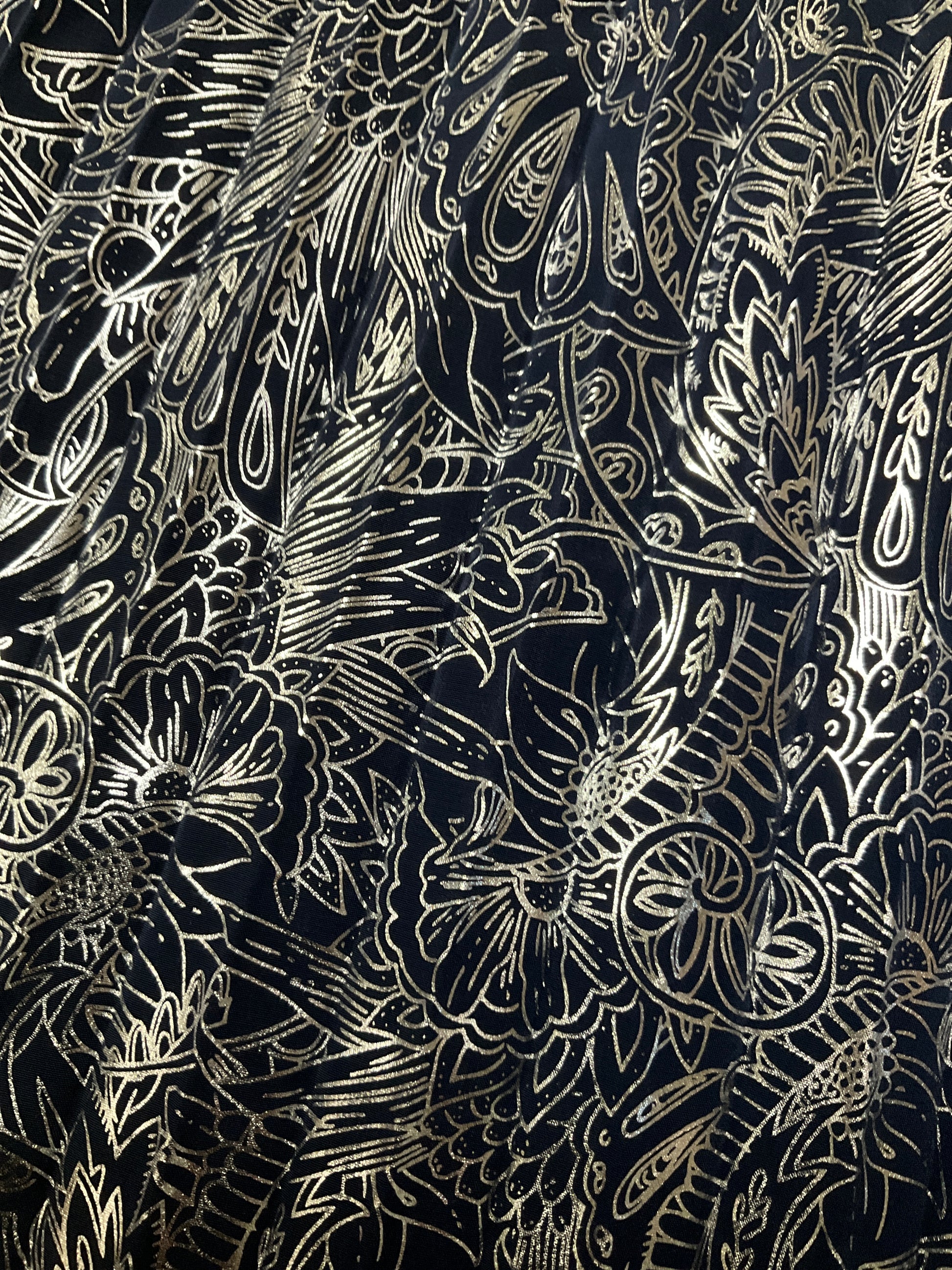 Description : NAVY BLUE WITH PLEATS ALL AROUND AND SHIMMER SILVER PAISLY PATTERN OVERAL. WIDE ELASTIC WAIST. ***TAG SAYS 3XL BUT PLEASE NOTE MEASUREMENTS, APPEARS TO FIT MORE LIKE A 16-18.***