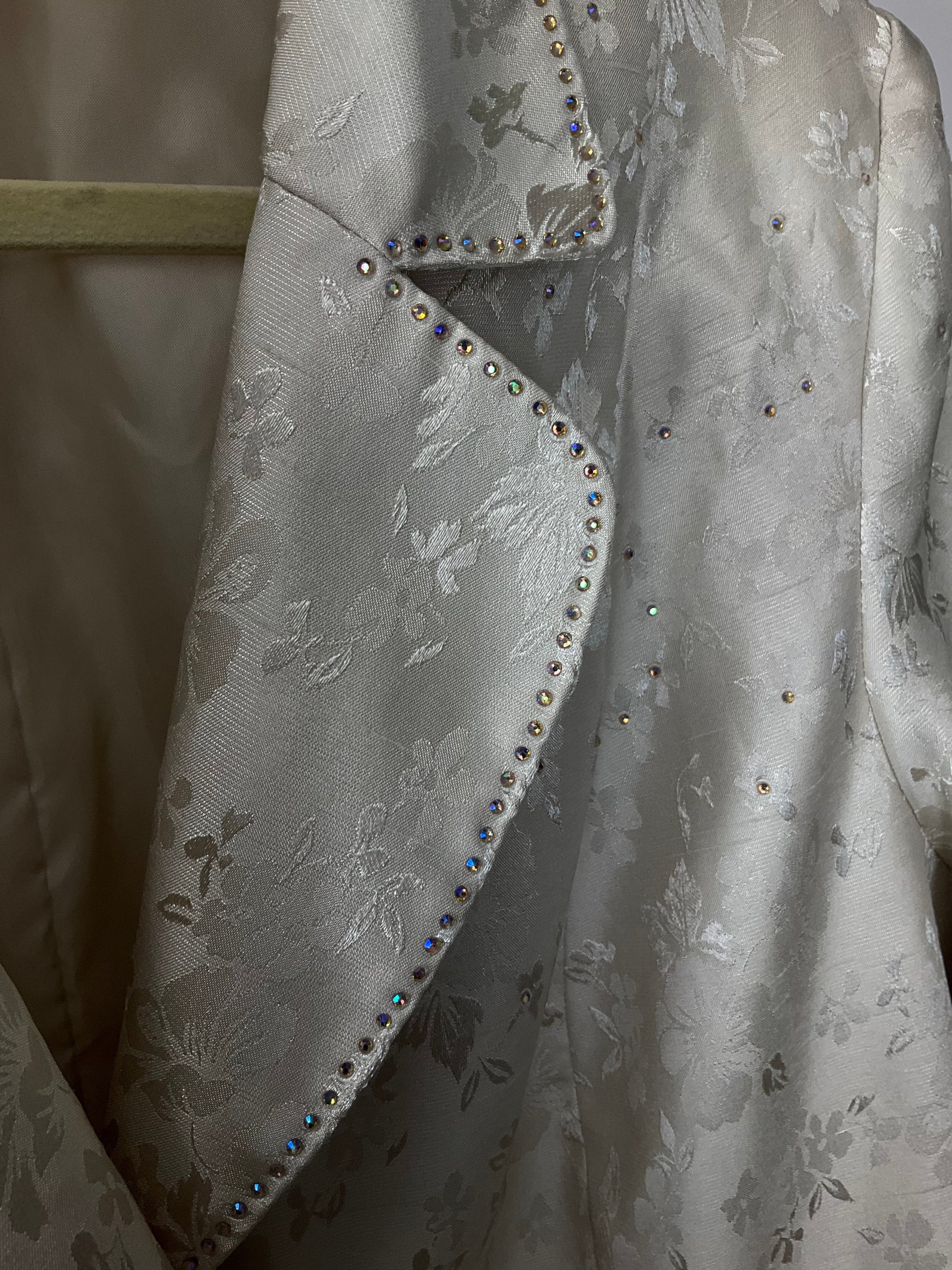 Description : Nicolette cream floral skirt suit. Beautiful details on this suit with shimmer floral pattern with rounded, notched lapel with added rhinestones on lapel and on shoulders. Three cloth rosettes over blazer snaps. Skirt has gathered kick pleat and elastic on sides and center back zipper.