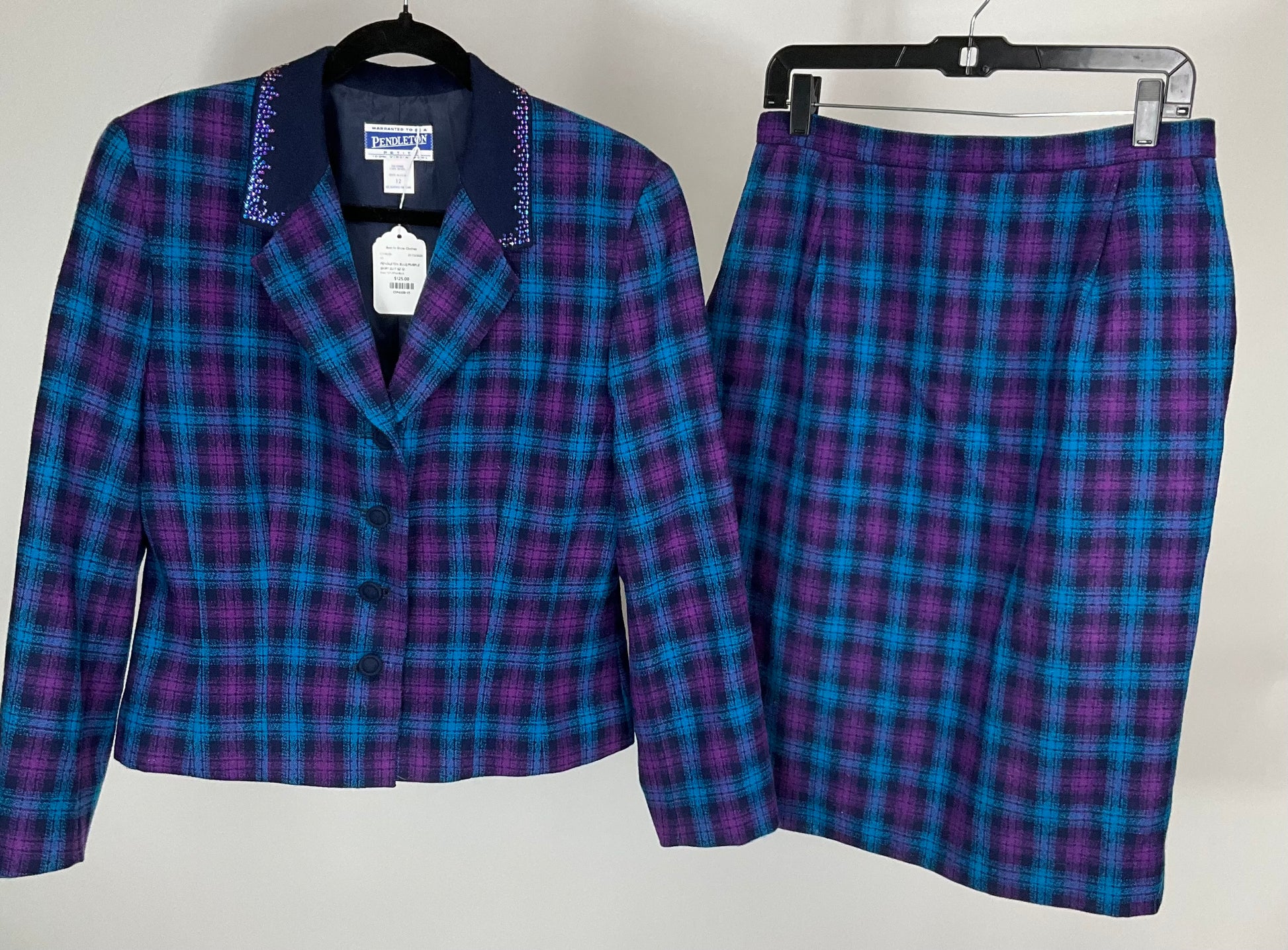 Description : PENDLETON BLUE. PURPLE AND BLACK PLAID WOOL SKIRT SUIT. BLAZER HAS FOUR CLOTHE BUTTON FRONT CLOSURE, NOTCHED LAPEL WITH ADDED COLOR SHIFTING RHINESTON ACCENTS, MATHCING PENCIL SKIRT WITH CENTER BACK KICK PLEAT, CENTER BACK ZIPPER AND BUTTON WITH ELASTIC ON BACK OF WAIST. SKIRT HAS POCKETS!! BOTH FULLY LINED.