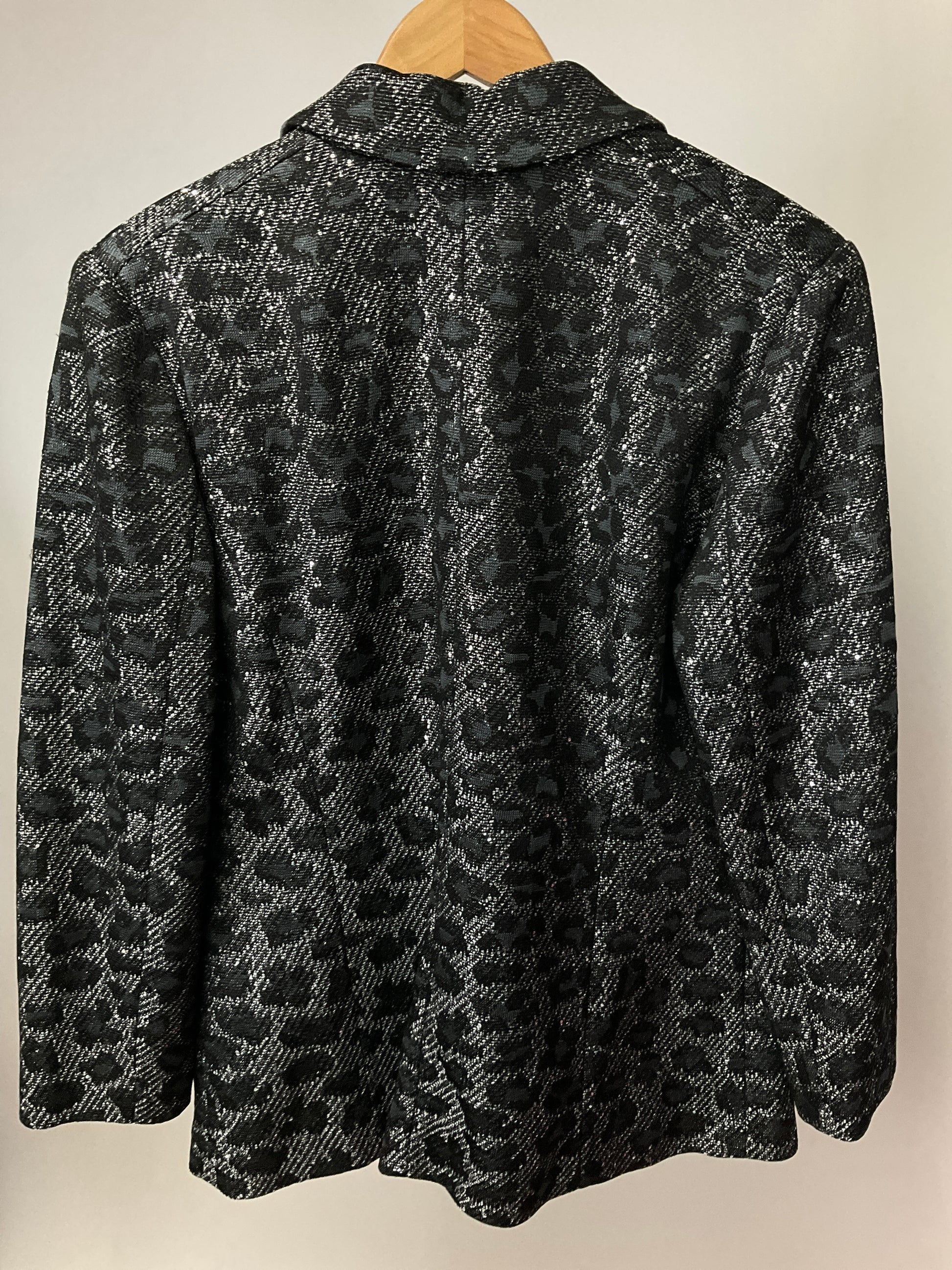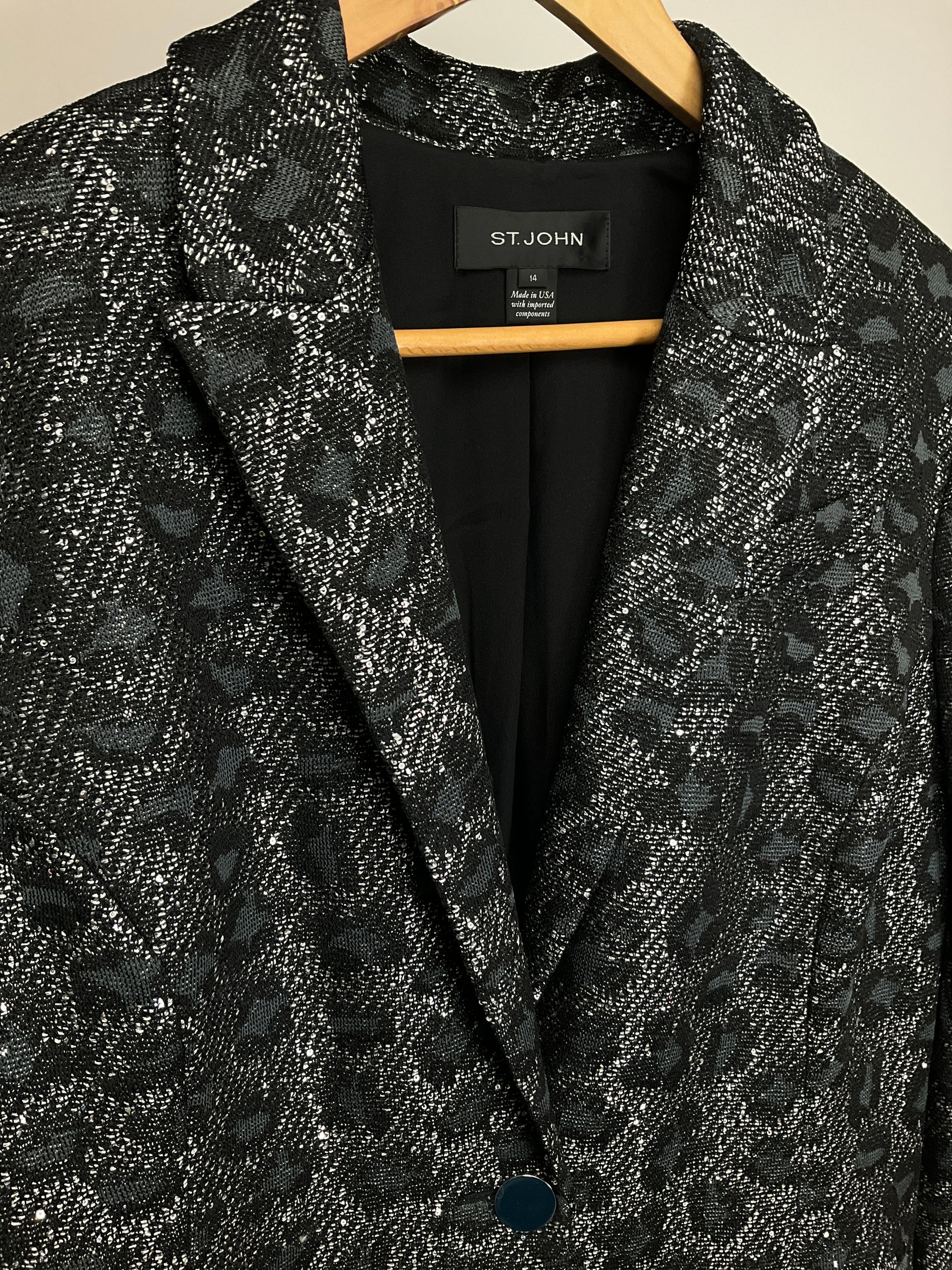 Description : ST JOHN BLACK & SILVER LEOPARD PRINT WITH SEQUINS AND SHIMMER THREAD BLAZER. NOTCHED LAPEL, SINGLE BUTTON FRONT CLOSURE, REAL FLAP POCKETS. FULLY LINED.