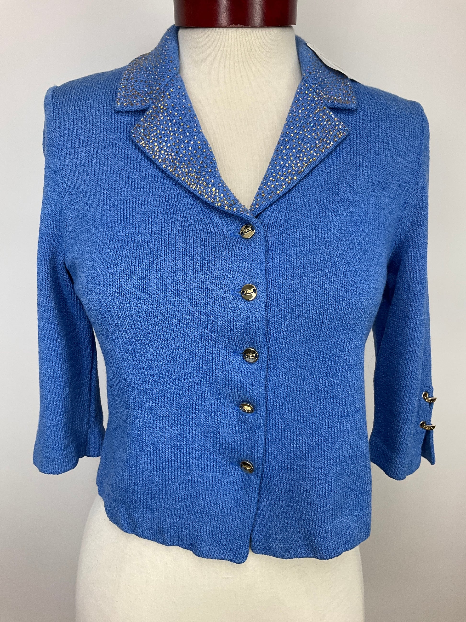 Description : ST JOHN COLLLECTION BY MARIE GRAY ROBIN'S EGG BLUE BLAZER WITH GOLD LOGO BUTTONS FOR FRONT CLOSURE, THREE QUARTER NOTCHED SLEEVE WITH GOLF LOGO EMBELLISHMENTS AND COLOR SHIFTING RHINESTONES ADDED TO NOTCHED LAPEL. SMALL REPAIR ON LOWER BACK.