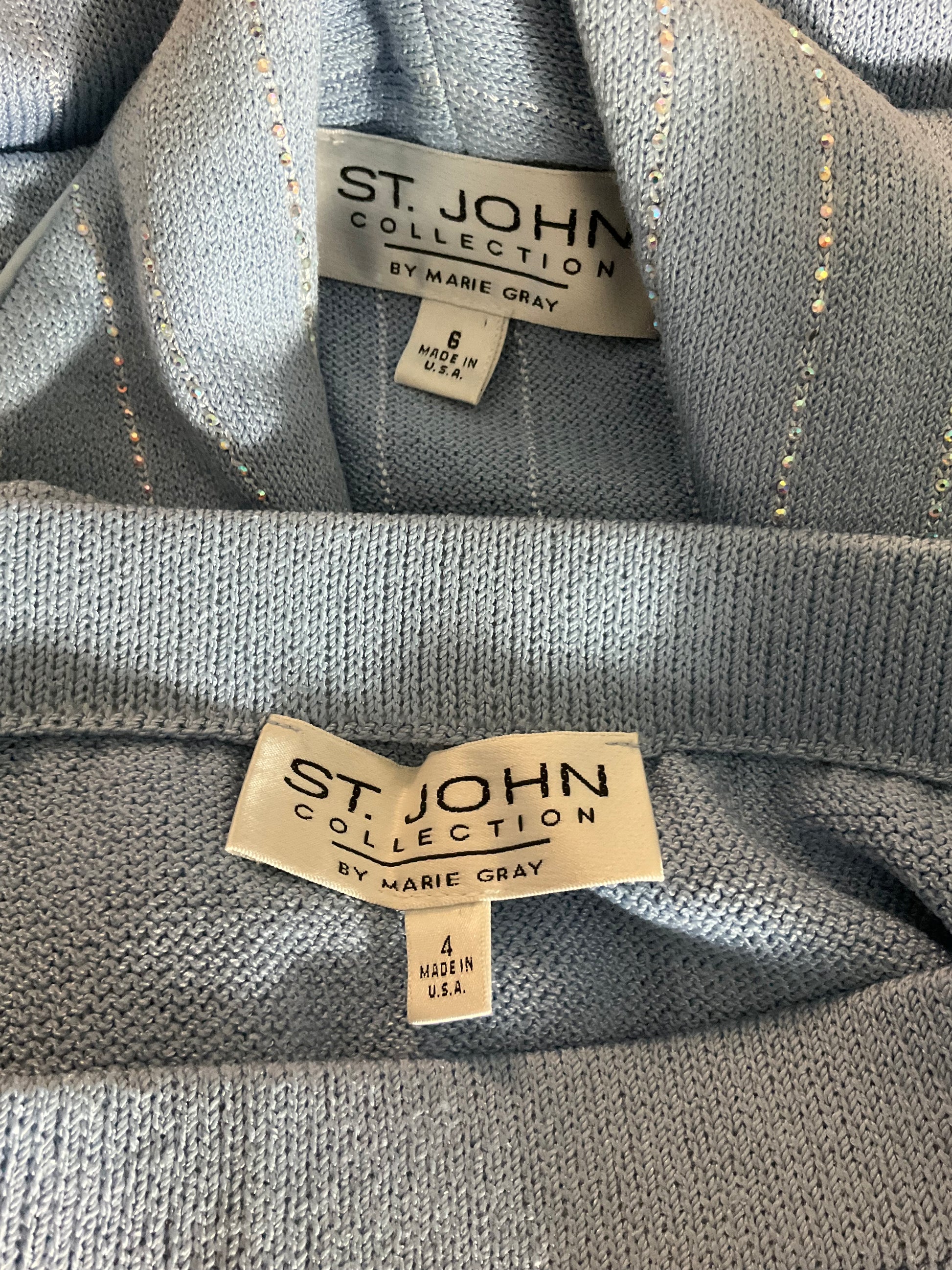 Description : ST JOHN COLLECTION BABY BLUE KNIT SKIRT SUIT. BLAZER IS SZ 6 WITH WIDE LAPEL WITH ADDED RHINESTONES ALONG VERTICAL LINES, DOUBLE GOLD AND BLUE ENAMEL BUTTONS BESIDE THE ZIPPER FRONT, SATIN PIPING EDGING. MATCHING PENCIL SKIRT IS SIZE 4 WITH ELASTIC WAIST AND CLASSIC SANTANA KNIT.