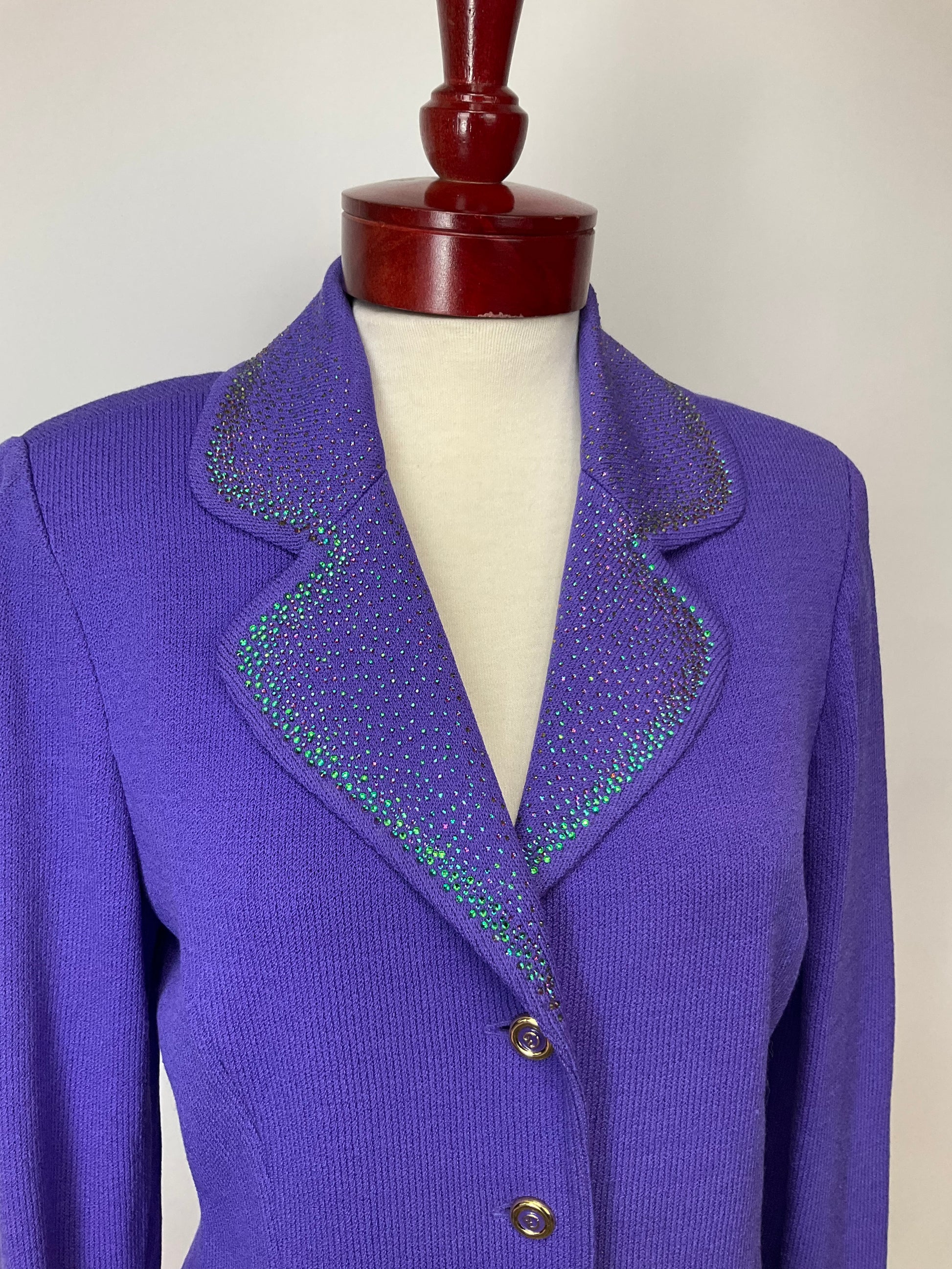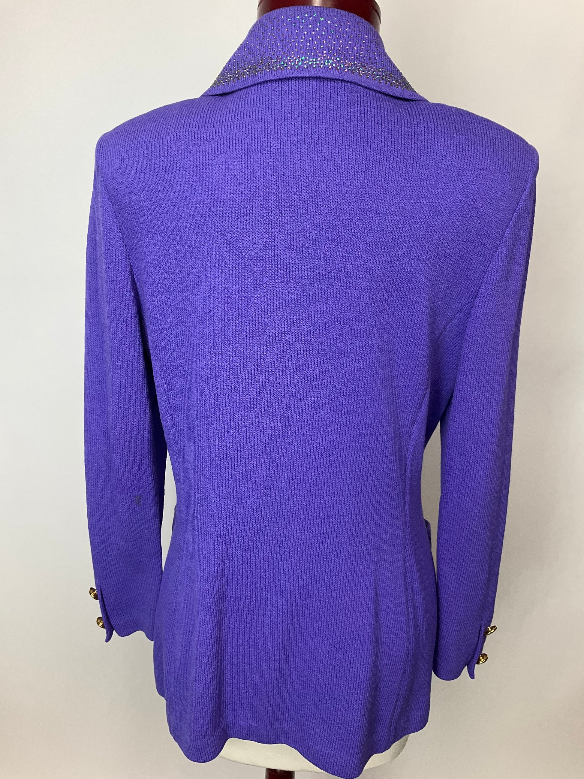 Description : ST JOHN COLLECTION PURPLE SANTANA KNIT BLAZER WITH HANDSET, COLOR-SHIFTING RHINESTONE COVERED NOTCHED LAPEL WITH GOLD AND PURPLE ENAMEL LOGO BUTTONS. BUTTONS ALSO ON SLEEVES. SMALL STAIN ON BACK OF LEFT FOREARM.