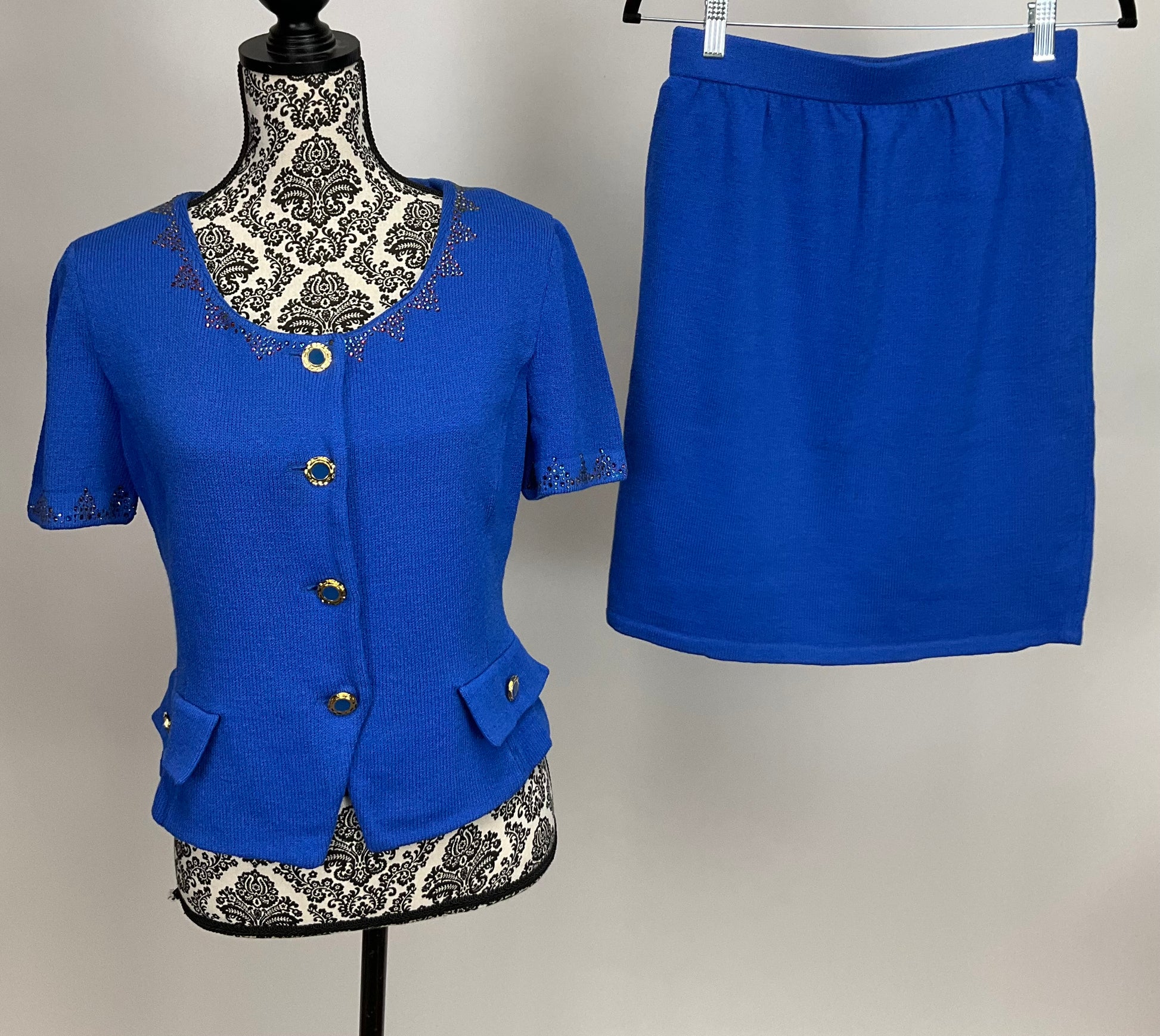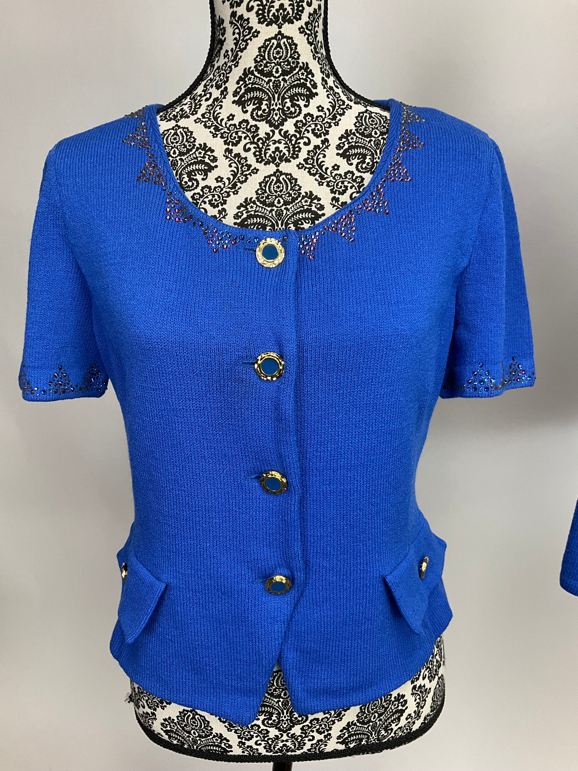 Description : ST JOHN COLLECTION ROYAL BLUE SKIRT SUIT IN CLASSIC SANTANA KNIT. SHORT SLEEVE BLAZER WITH FOUR GOLD & BLUE ENAMEL BUTTONS, COLOR SHIFTING RHINESTONES ADDED TO COLLAR AND SLEEVE EDGES. PRINCESS SEAMS FOR A MORE FITTED LOOK. MATCHING PENCIL SKIRT WITH ELASTIC WAIST.