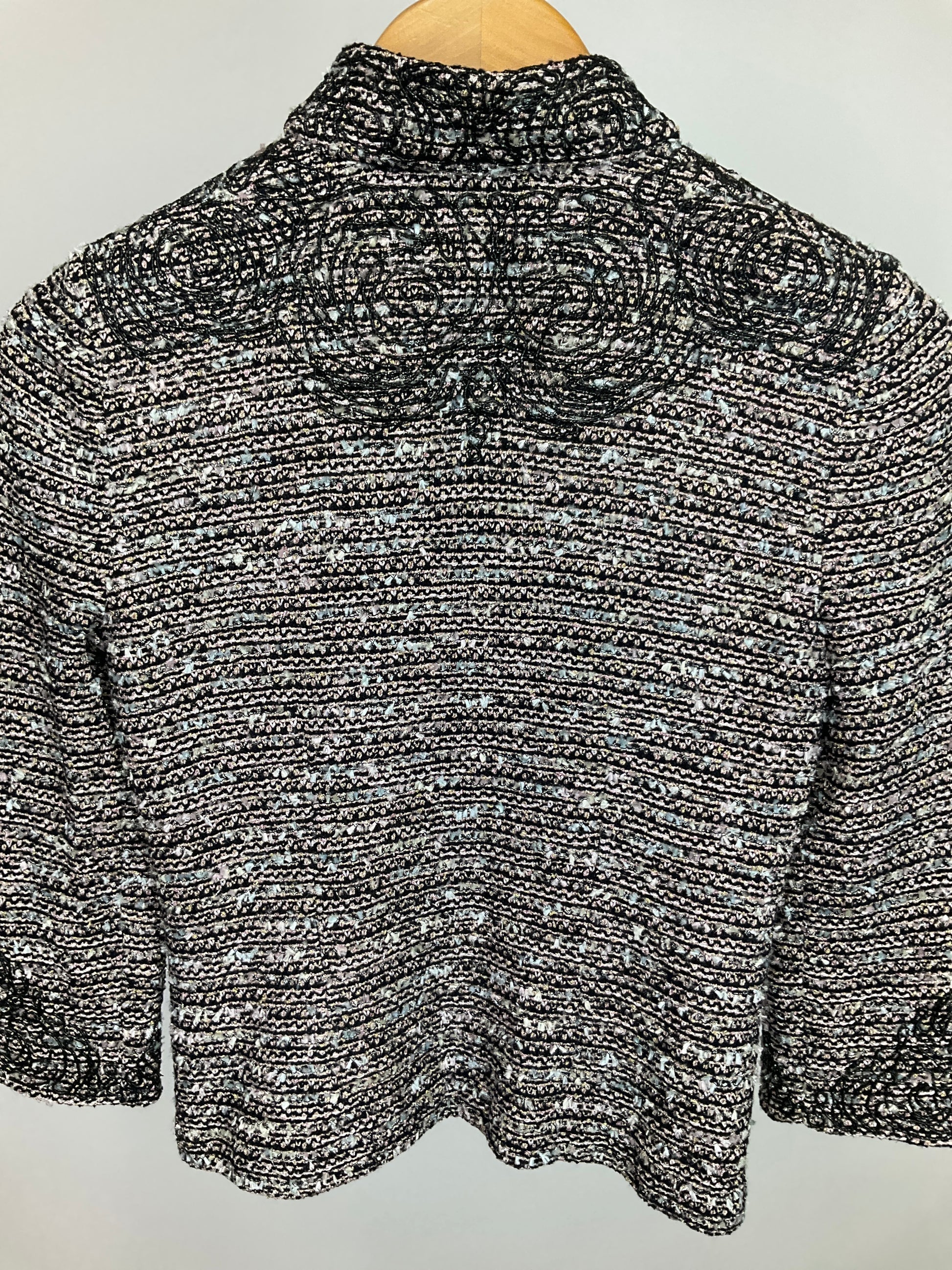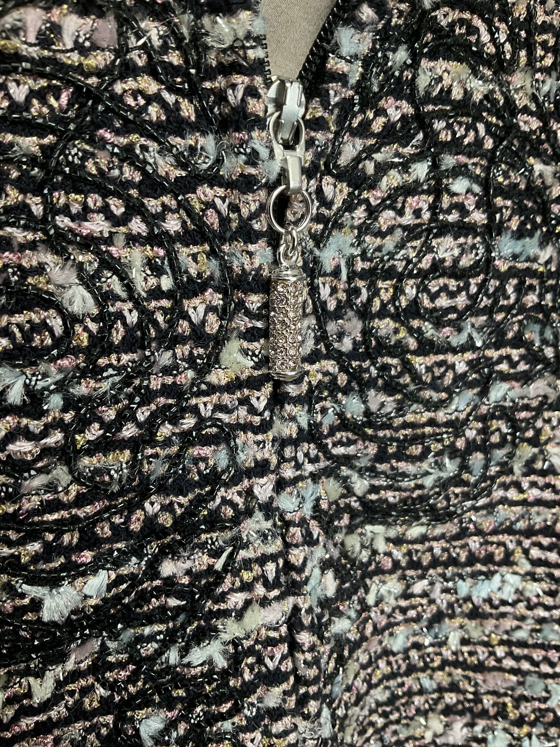 Description : ST JOHN COUTURE PINK, BLACK, SHIMMER SILVER AND BLUE RIBBON THREAD WITH ZIPPER FRONT AND SATIN TURN UP CUFFS. BLACK BEADED SWIRL EMBELLISHMENT AROUND CUFFS AND SHOULDERS. FULLY LINED WITH SOME STAINS ON LINING.