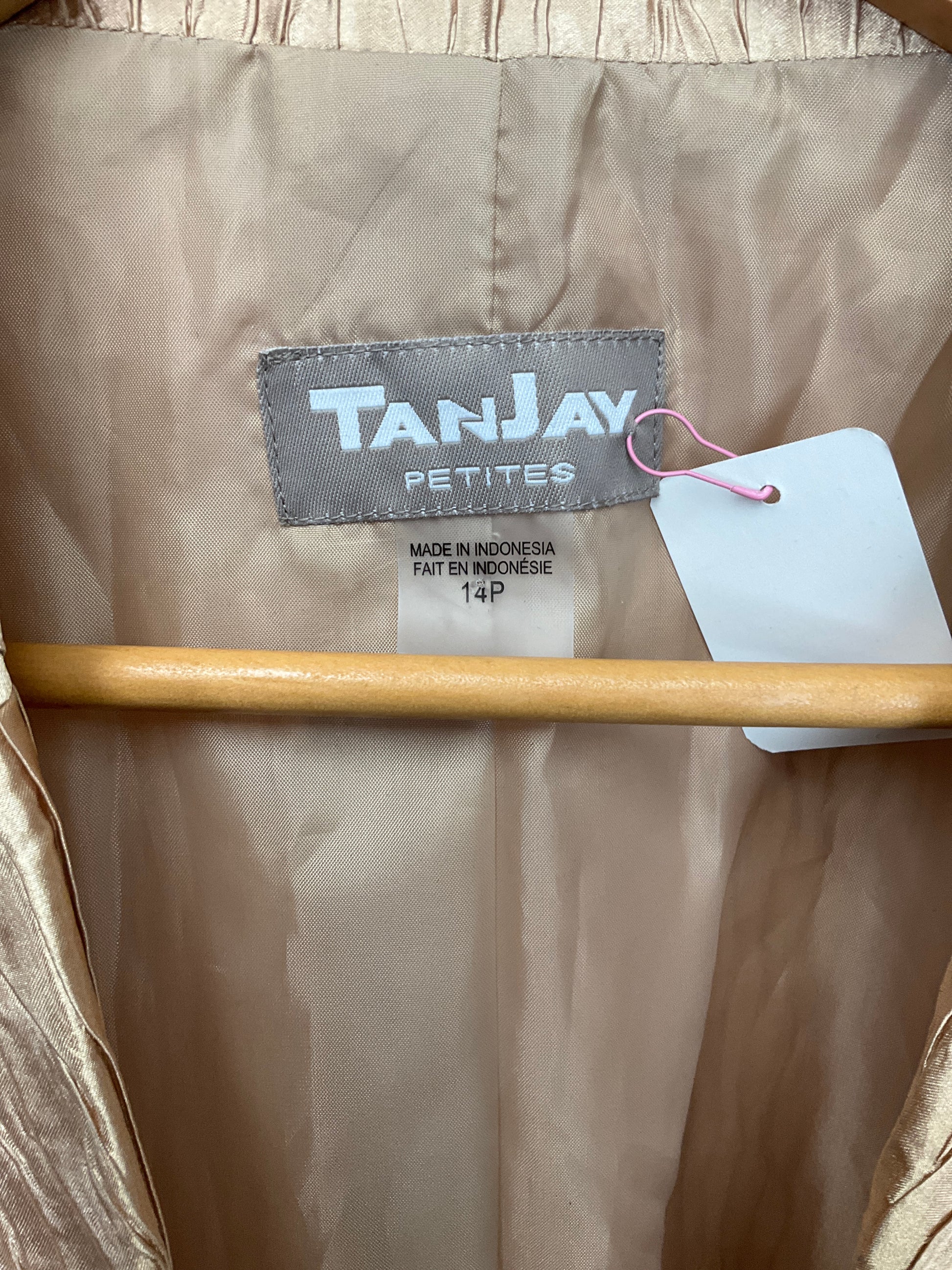 Description : TAN JAY SHIMMER GOLD CRINKLE BLAZER OPEN FRONT, THREE-QUARTER SLEEVES AND FULLY LINED. MACHINE WASHABLE . IT IS A DEEP GOLDEN COLOR THAT LOOKS BRIGHTER IN PERSON.