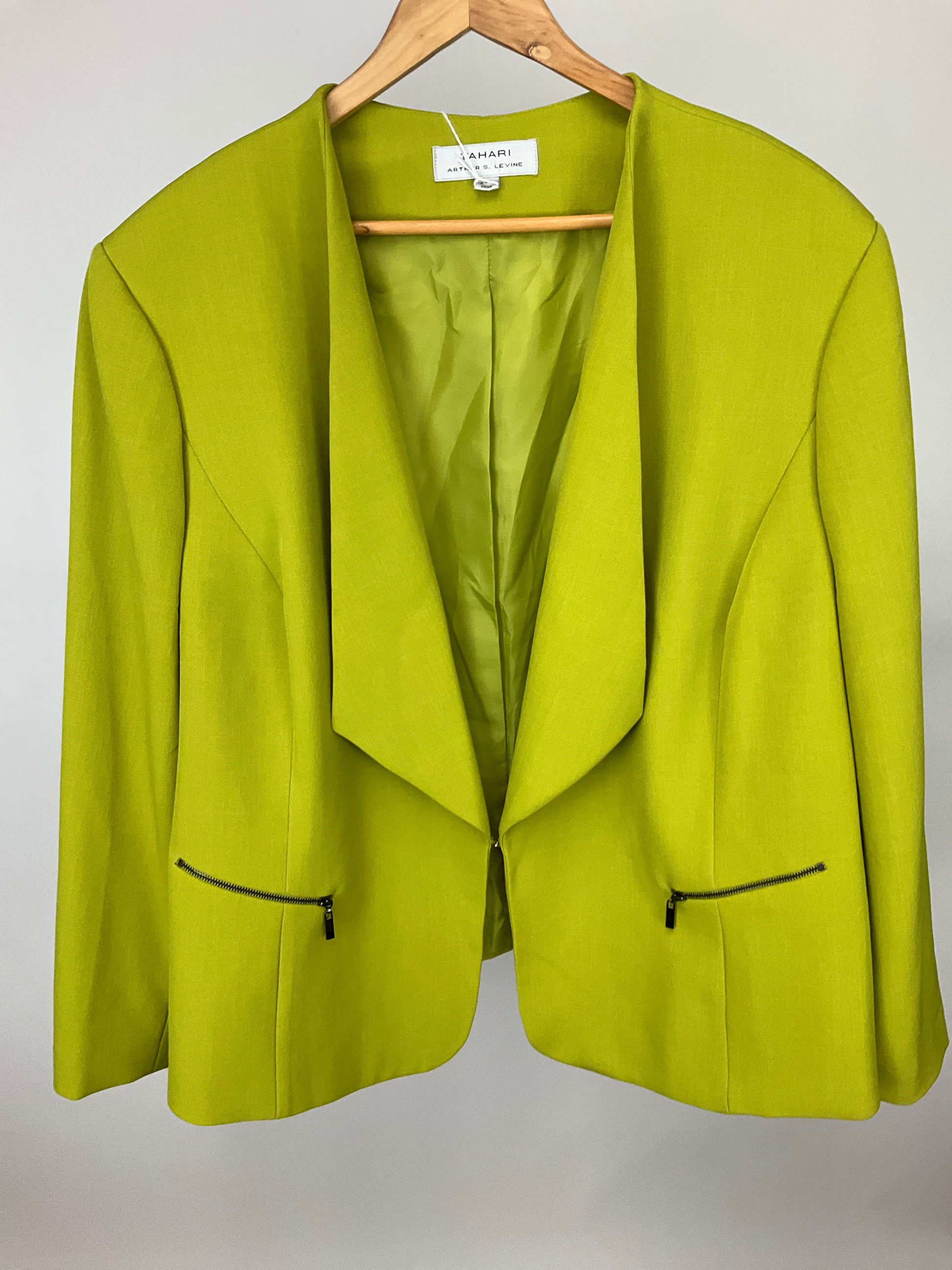 Description : TAHARI GREEN COLLARLESS BLAZER WITH DEEP, WIDE LAPEL, SINGLE HOOK & EYE FRONT CLOSURE WITH REAL ZIPPER POCKETS. FULLY LINED,